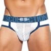 Jockstrap super doux et confortable en coton extensible. Lacet devant évoquant le football américain. Poche ergonomique qui épouse et soutient les organes génitaux, sans les comprimer, Ceinture élastique amincissante signée Andrew Christian. Edition limitée.