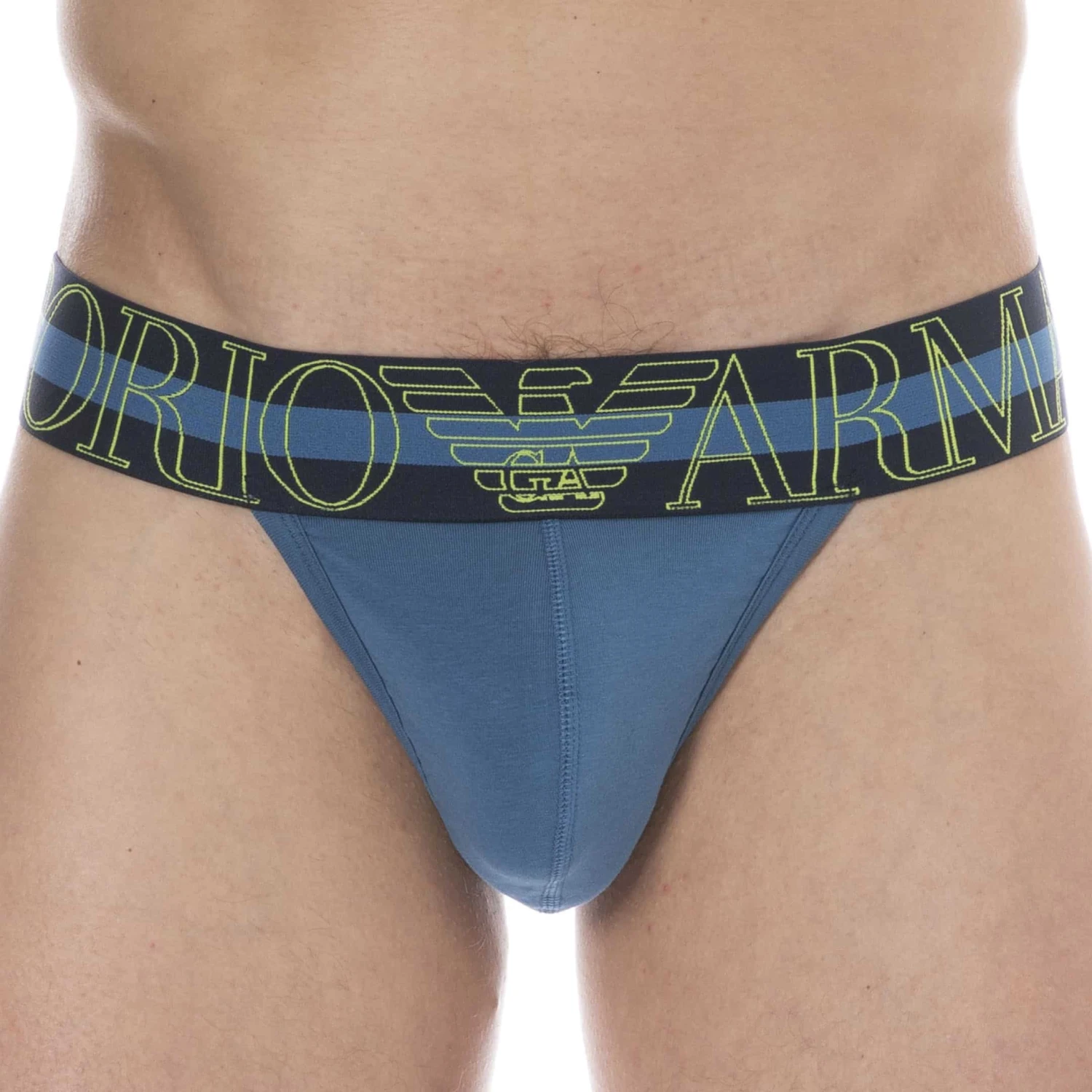 Jockstrap en coton bio extensible, trÚs doux et confortable. Coupe taille basse, simple et élégante. Poche frontale doublée. Large ceinture élastique contrastée signée Emporio Armani.