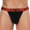 Jockstrap taille basse trĂšs ajustĂ© en voile transparent extensible et confortable. Poche frontale non doublĂ©e. Ceinture Ă©lastique imprimĂ©e d’un motif serpent dorĂ©. Logo AD en silicone.