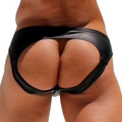 Jockstrap sexy composĂ© d’un mĂ©lange de Nylon et de Spandex qui lui donne un aspect caoutchouteux. Les parties avant et arriĂšre sont jointes par des boucles carrĂ©es en mĂ©tal noir mat. Poche doublĂ©e. Rivet Rufskin sur la ceinture Ă©lastique. FabriquĂ© en Californie.