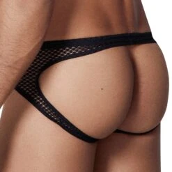 Jockstrap sexy en microfibre extensible, douce et confortable. EmpiÚcements en résille transparente. Poche frontale ergonomique non doublée. Fine ceinture élastique recouverte.