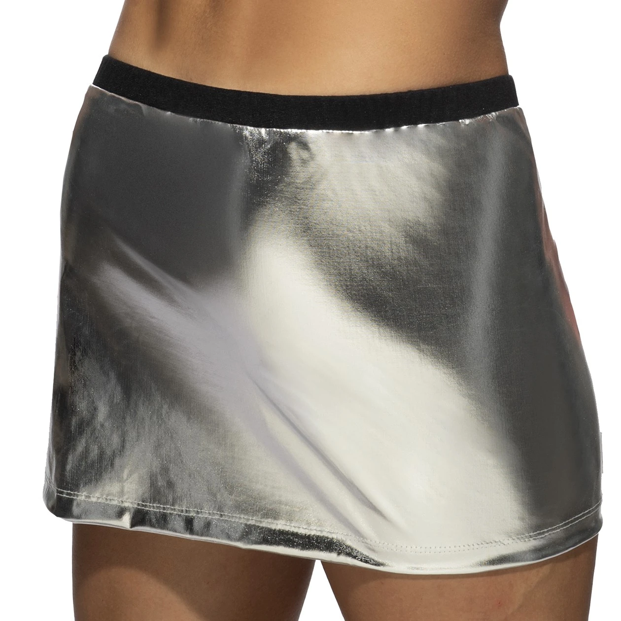 Jupe sexy en microfibre laminée pour un aspect métallique brillant. Large ouverture sur le cÎté. Ceinture fermée par bouton-pression métallique. Logo AD en silicone.