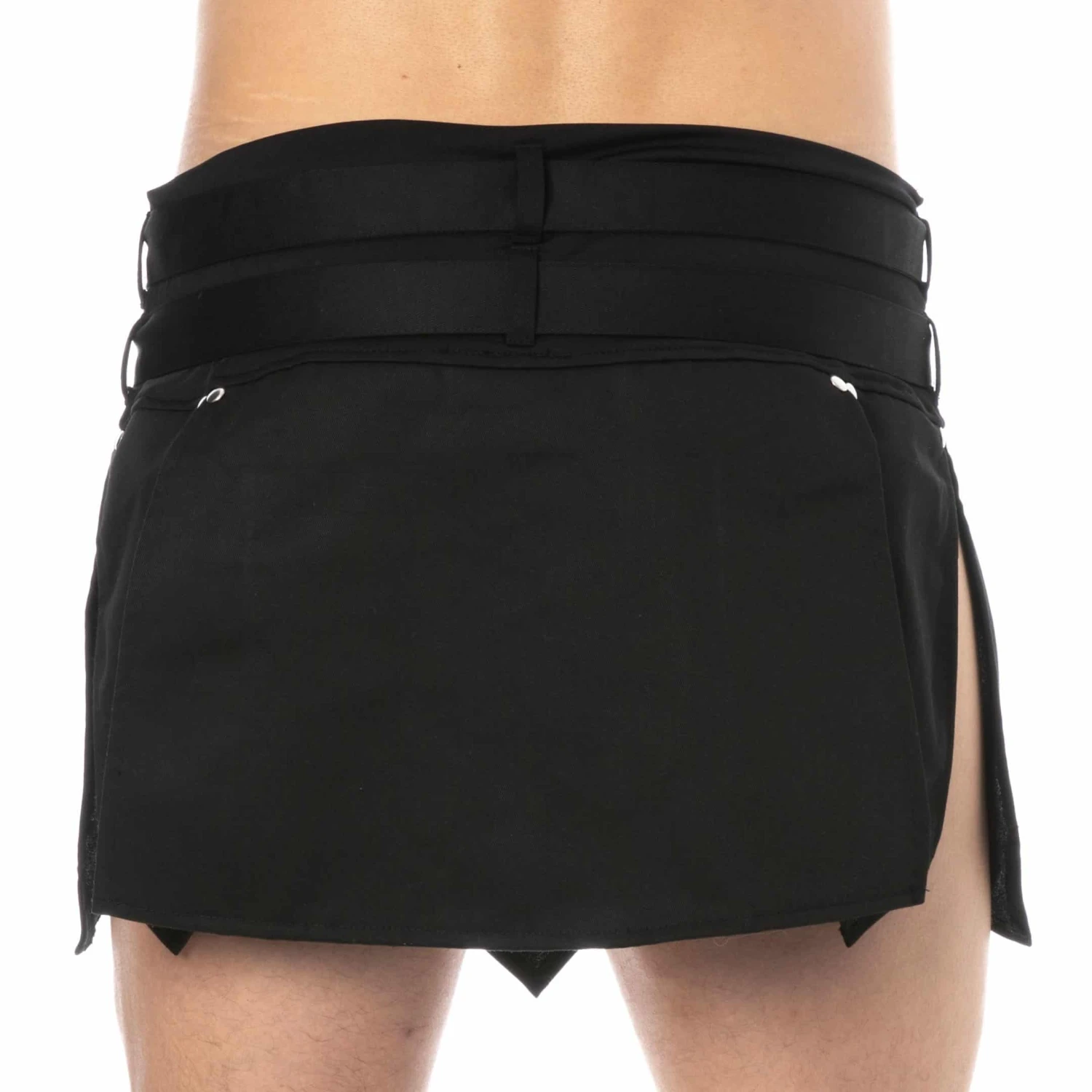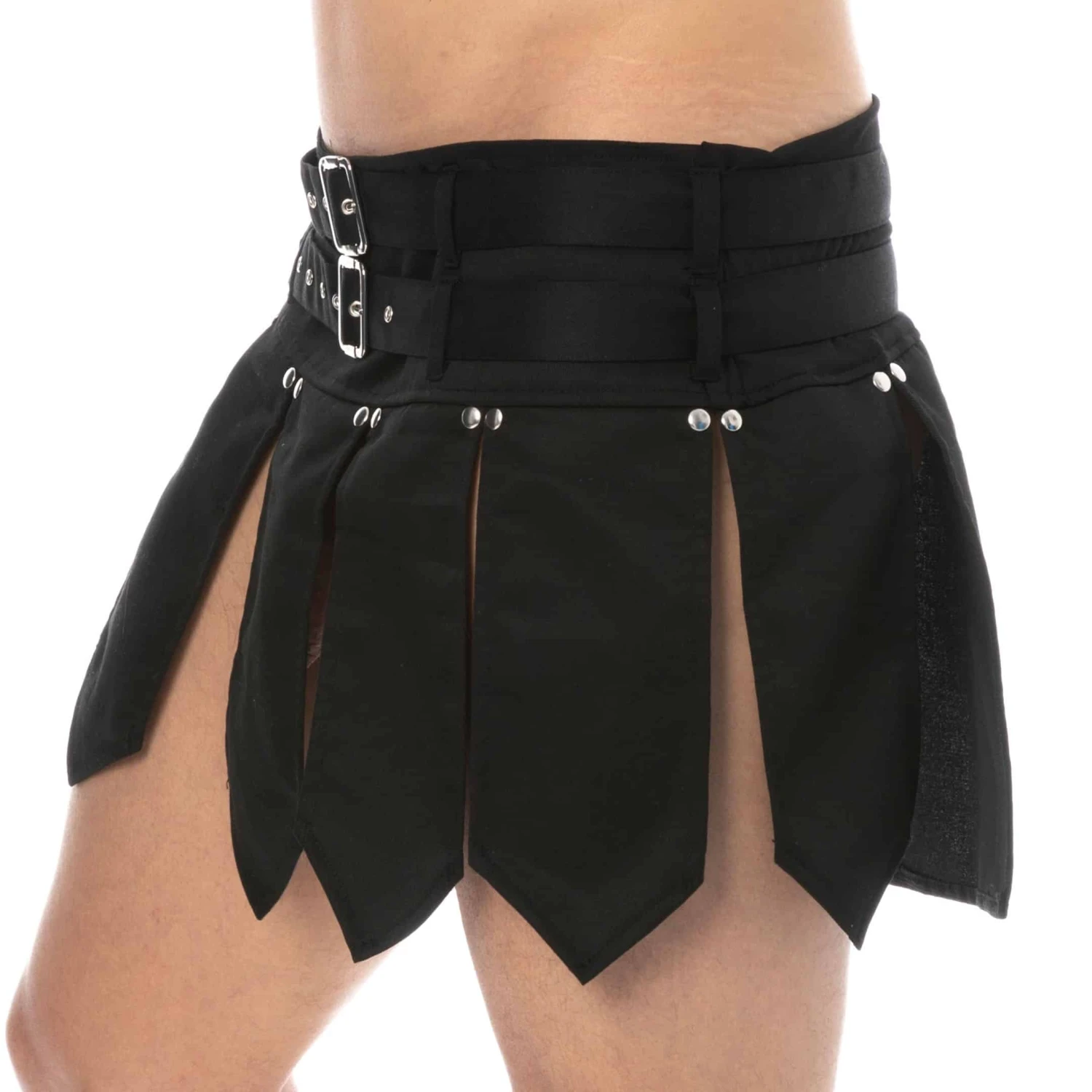 Jupe masculine à lanières, dans le plus pur style gladiateur. En simili cuir, avec accessoires métalliques. Double ceinture avec boucles.