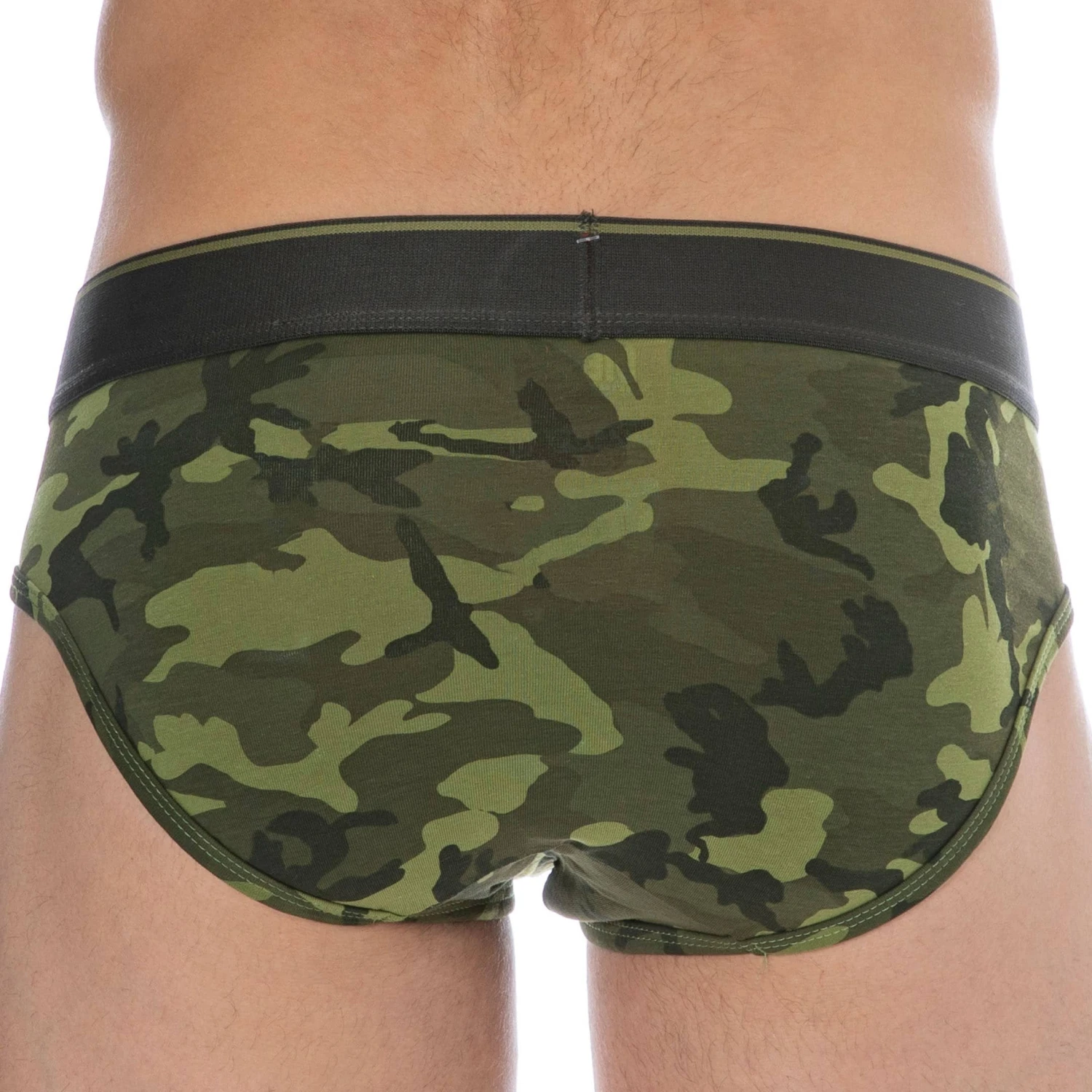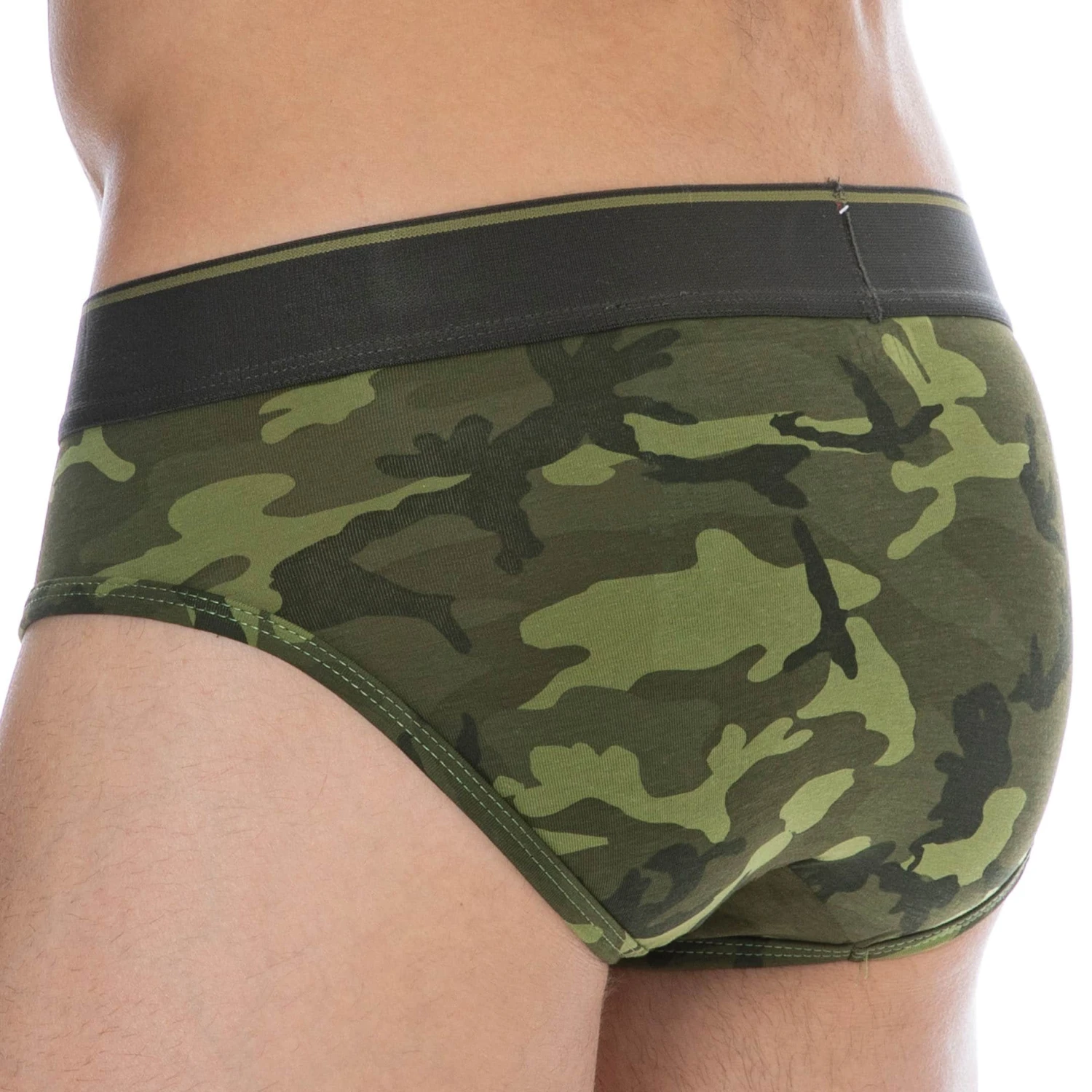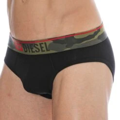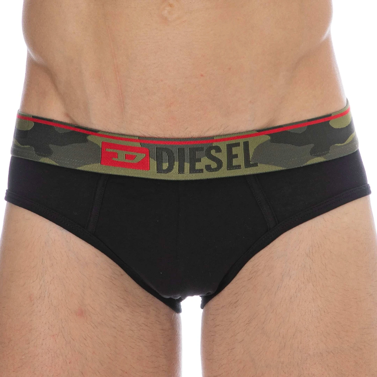 Lot de 2 slips en coton stretch, doux et confortable. 1 slip uni et un slip à motif camouflage. Poche frontale doublée. Ceinture élastique signée Diesel.