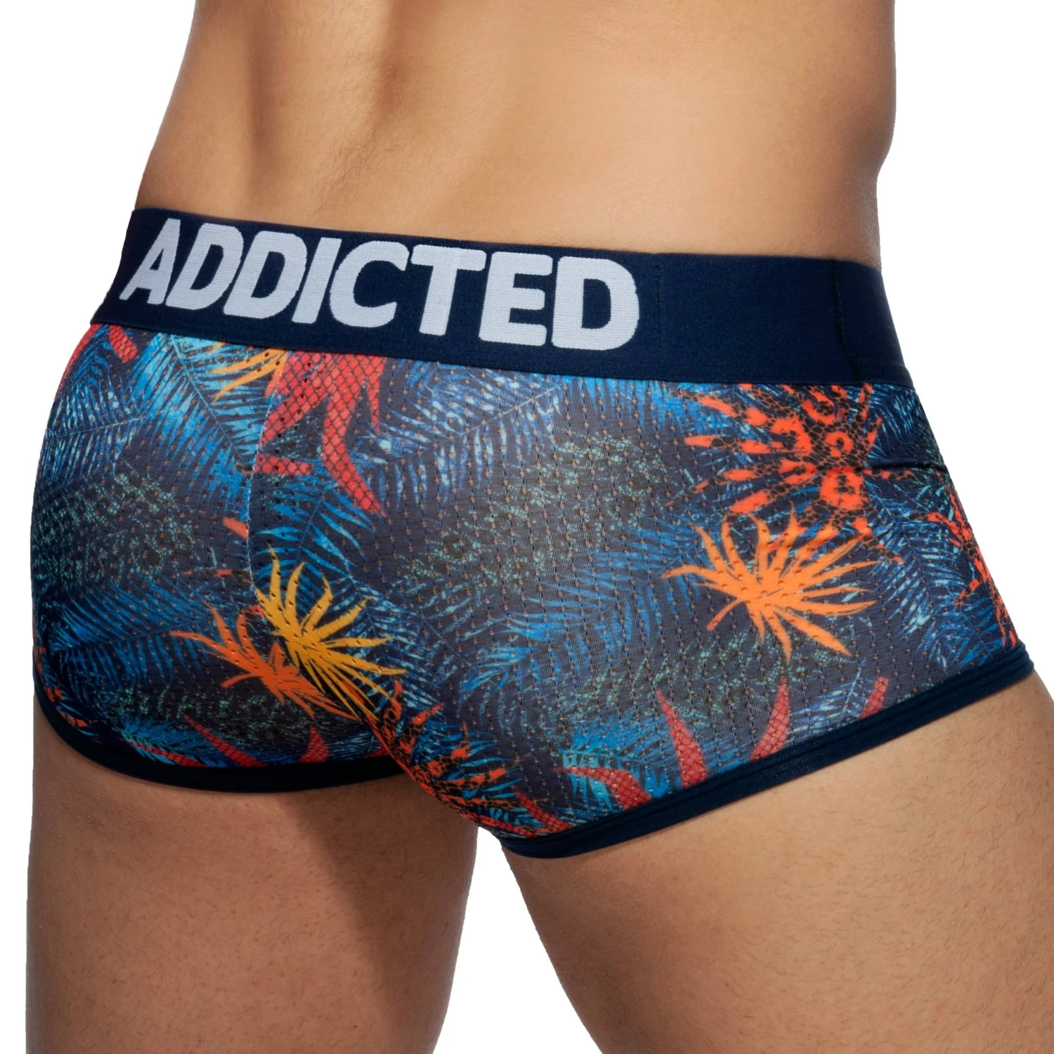 Lot de 3 boxers en mesh respirant et confortable. Imprimé tropical dans 3 teintes différentes. Poche push up pour augmenter votre volume frontal. Ceinture élastique signée Addicted.