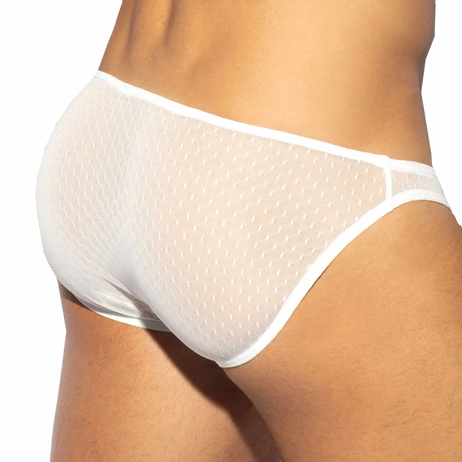 Slip ultra sexy en résille transparente. Coupe taille basse minimaliste. Ceinture élastique signée du logo ES Collection en métal doré.