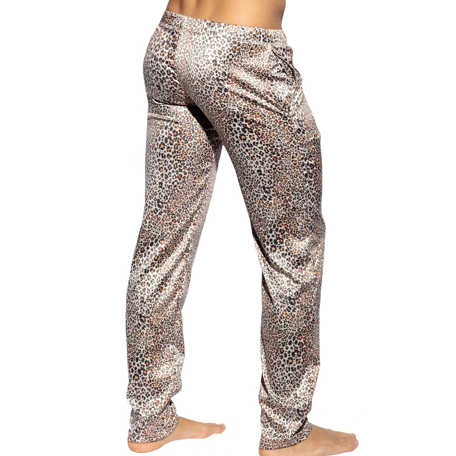 Pantalon d’intĂ©rieur taille basse en microfibre satinĂ©e imprimĂ©e d’un motif lĂ©opard. 2 poches. Ceinture Ă©lastique avec plaque mĂ©tallique dorĂ©e signĂ©e ES Collection.
