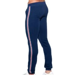 Pantalon en coton piqué doux et confortable. Bande sport tricolore le long des jambes. Ceinture élastique avec cordon de serrage. 2 poches. Logo ES Collection FIT sur la cuisse gauche.