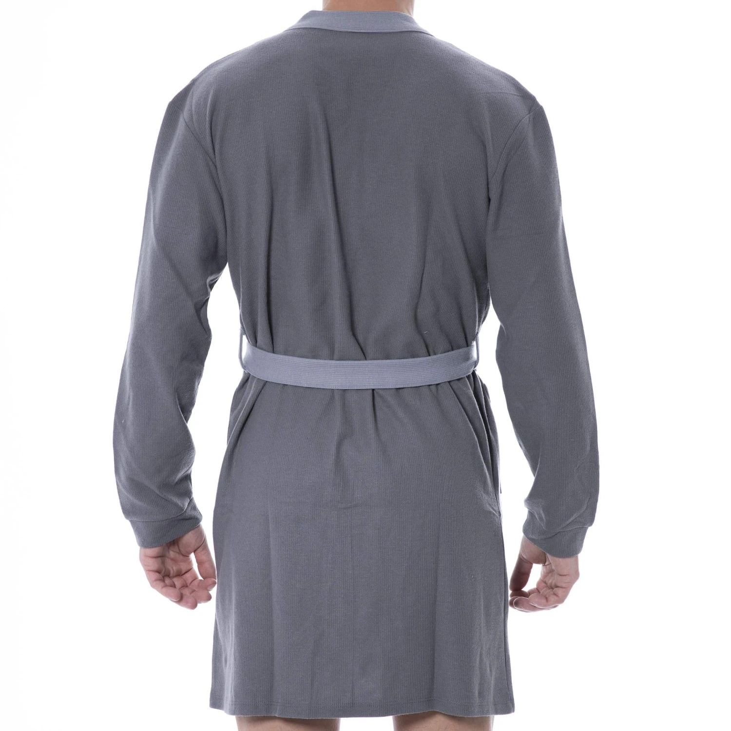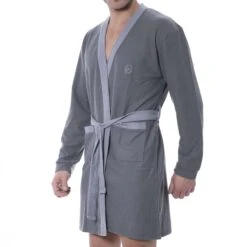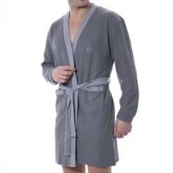 Peignoir tricoté en tissu trÚs doux et confortable. Coupe courte. Manches longues. Ceinture. 2 poches.