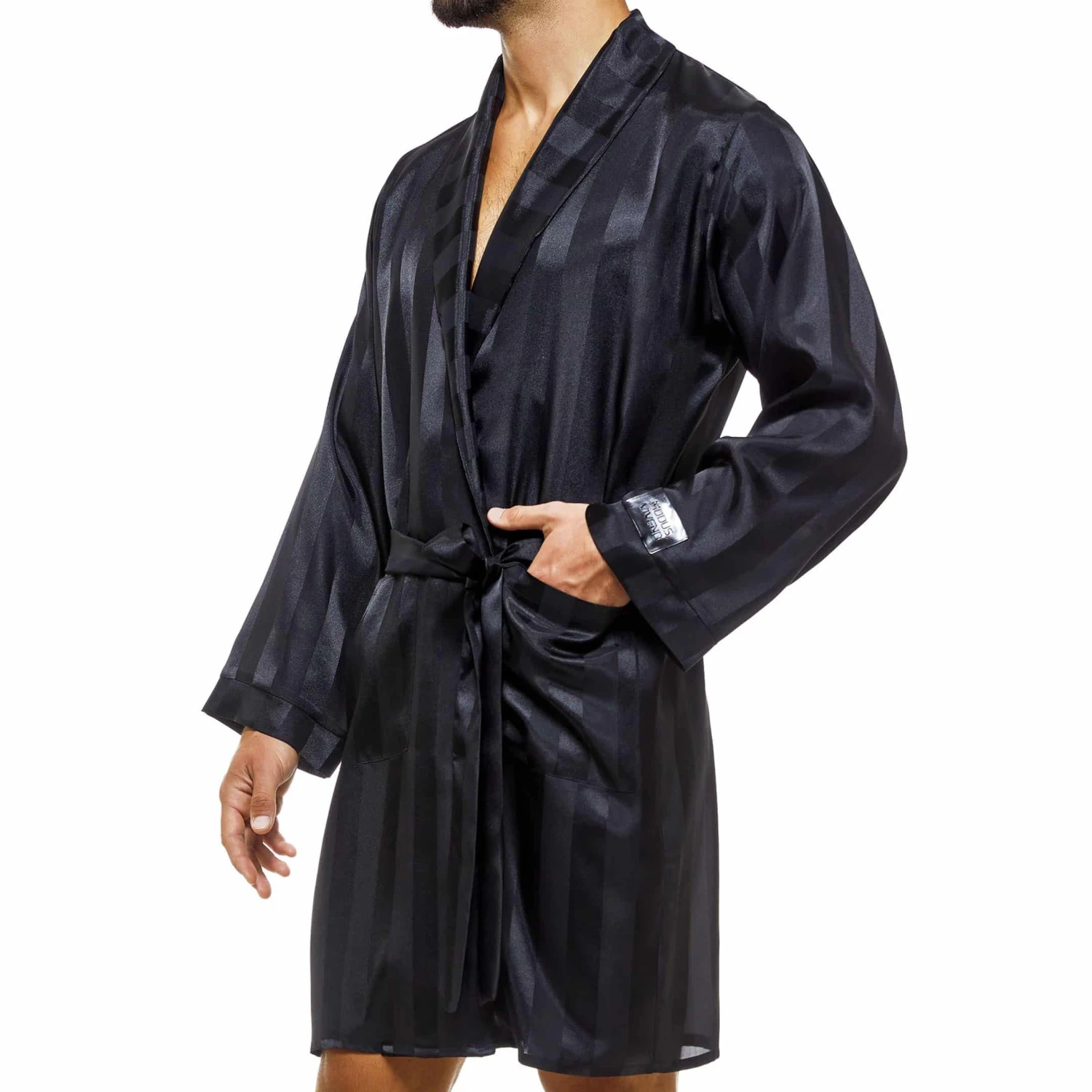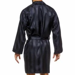 Robe de chambre élégante en microfibre satinée trÚs douce. Larges rayures verticales. 2 grandes poches. Ceinture à la taille. Logo Modus Vivendi sur la manche gauche.