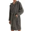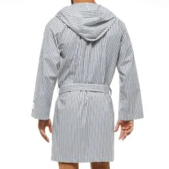 Robe de chambre élégante en coton tissé léger et confortable. Fines rayures verticales. Capuche. 2 grandes poches. Ceinture à la taille. Etiquette Modus Vivendi en silicone sur la manche gauche.