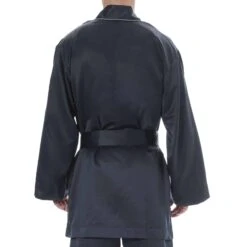 Robe de chambre élégante en coton tissé léger et confortable. Fines rayures verticales. Capuche. 2 grandes poches. Ceinture à la taille. Etiquette Modus Vivendi en silicone sur la manche gauche.
