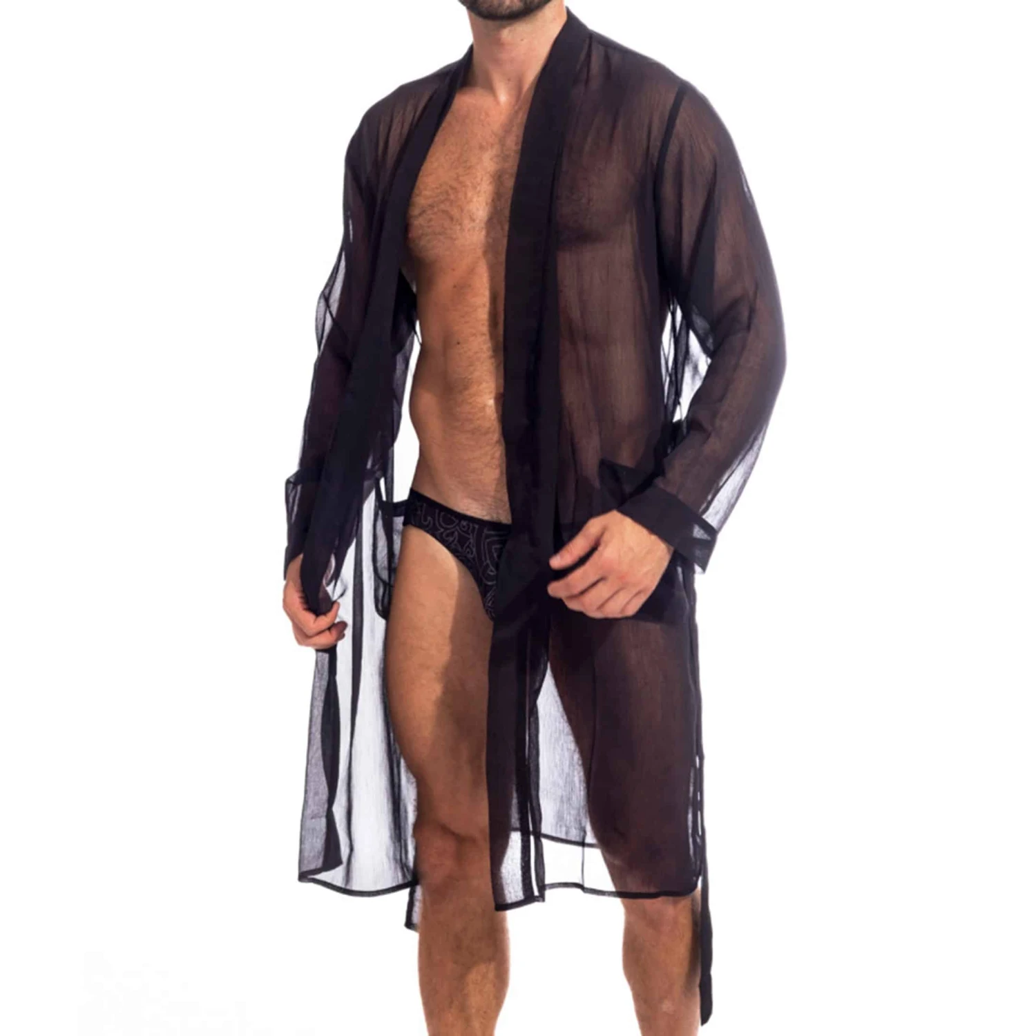 Kimono raffiné en mousseline légÚre et totalement transparente. 2 poches. Manches longues. Ceinture à la taille.