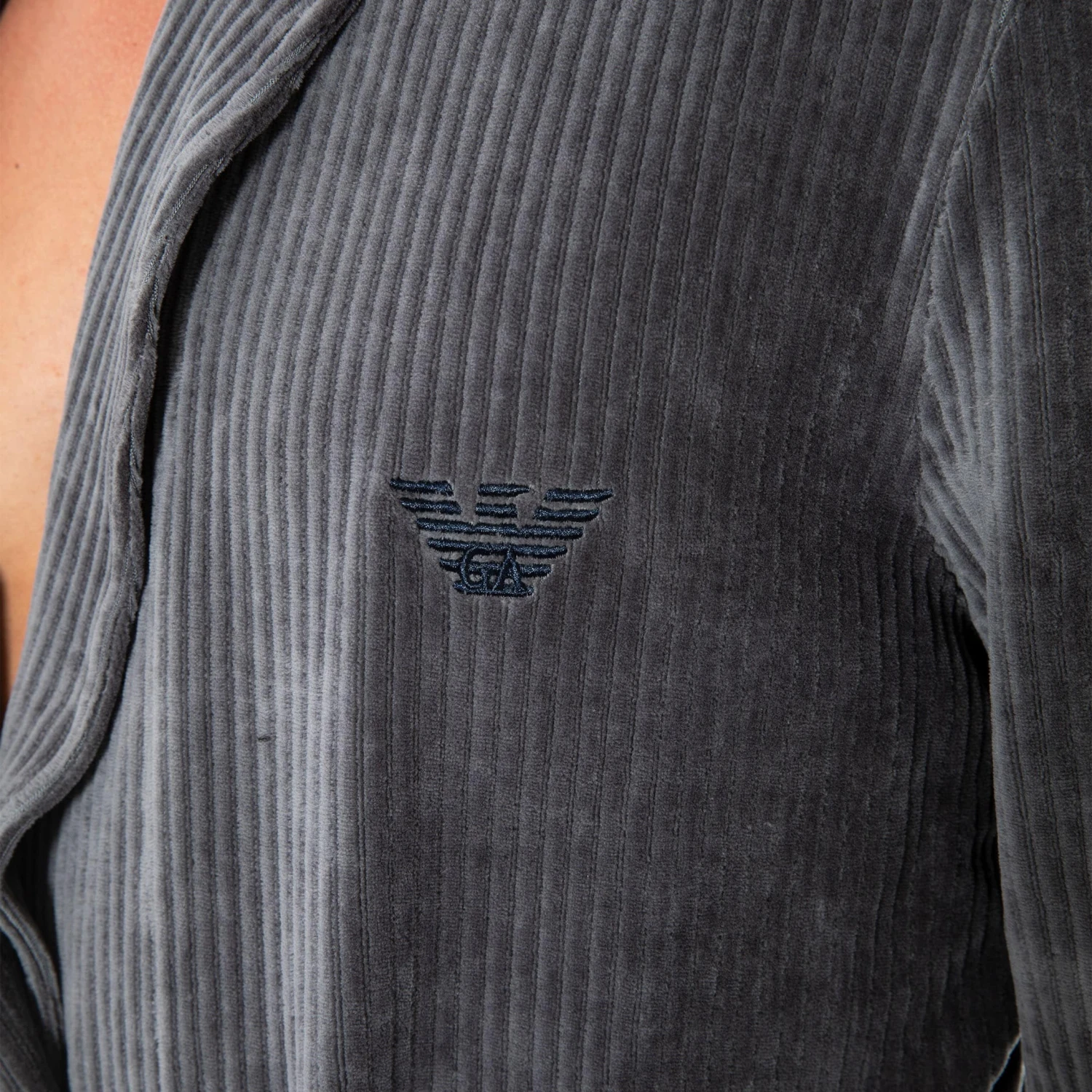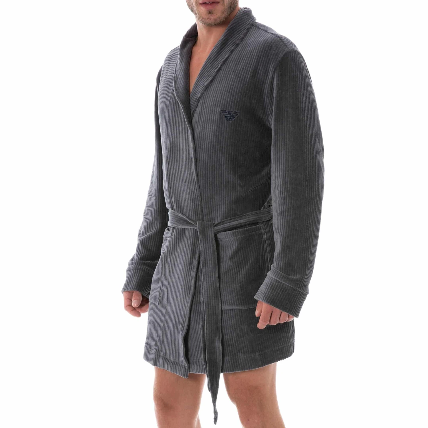 Robe de chambre en mélange de coton et de microfibre. Tissu cÎtelé super doux et chaud imitant le velours. Aigle iconique brodé sur la poitrine. Ceinture. 2 grandes poches.
