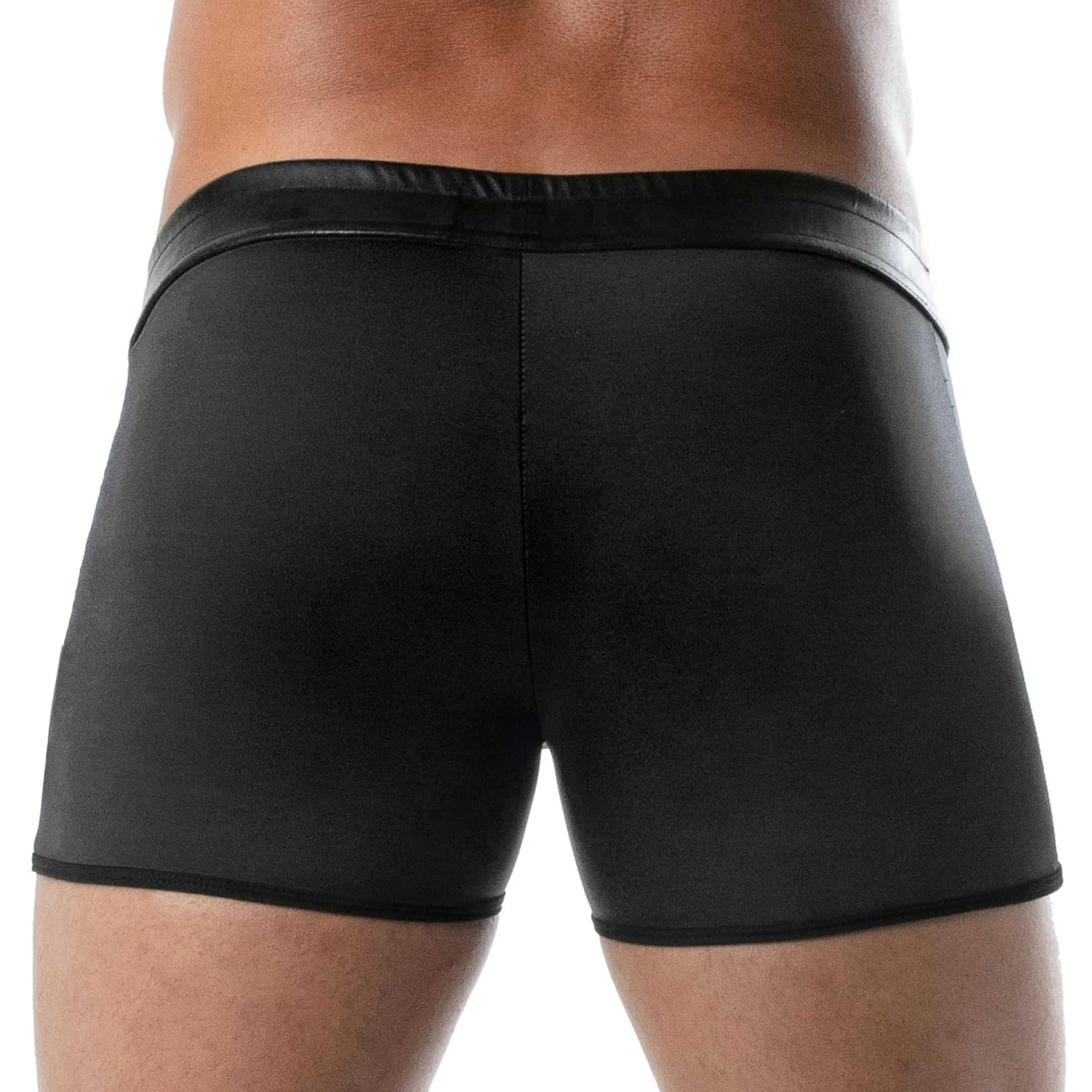 Short fetish moulant en microfibre extensible, confortable et légÚre. Poche frontale et ceinture en simili cuir. Bande verticale sur la poche frontale pour mettre en valeur votre masculinité. Logo TOF en silicone cousu sur la ceinture élastique. Fabrication française.