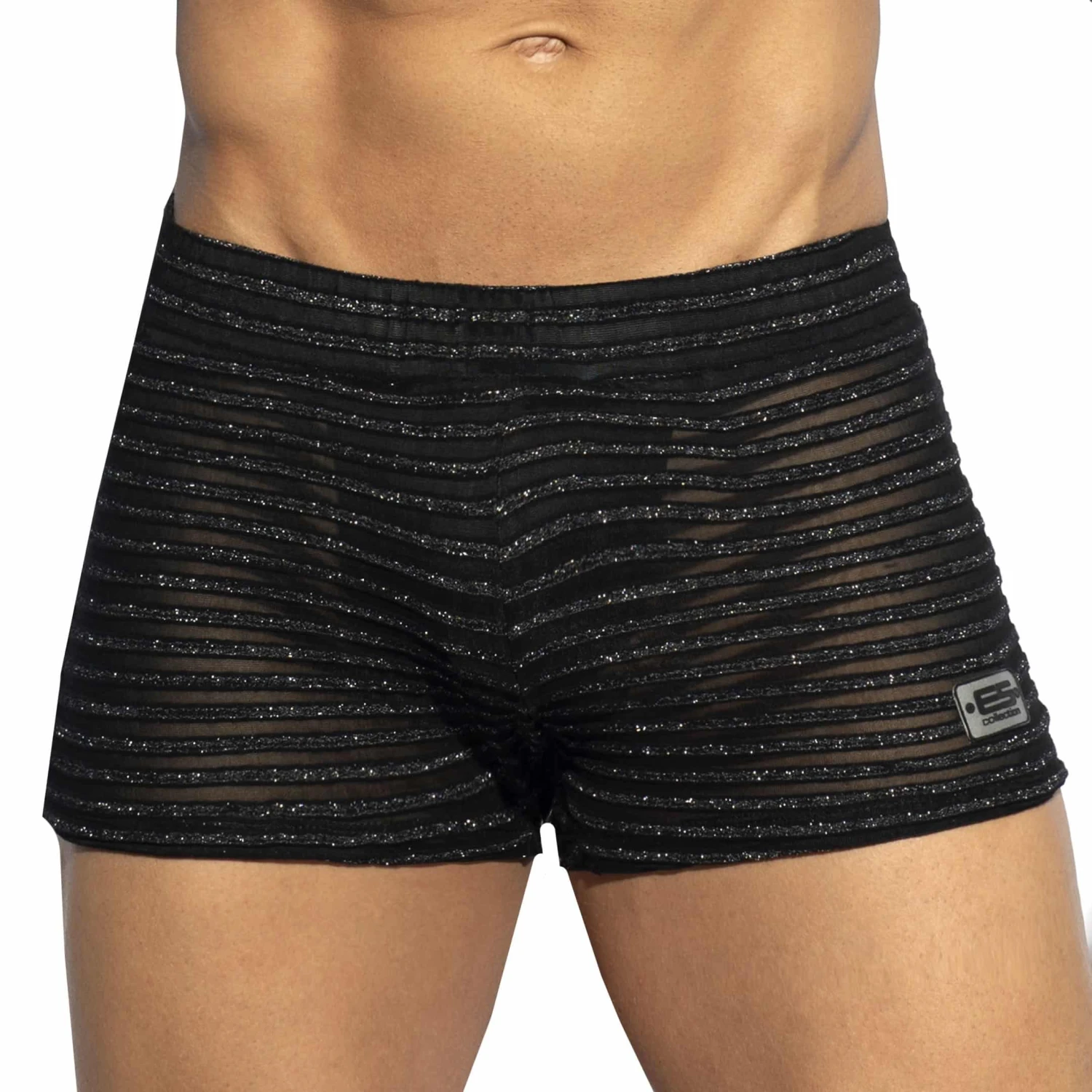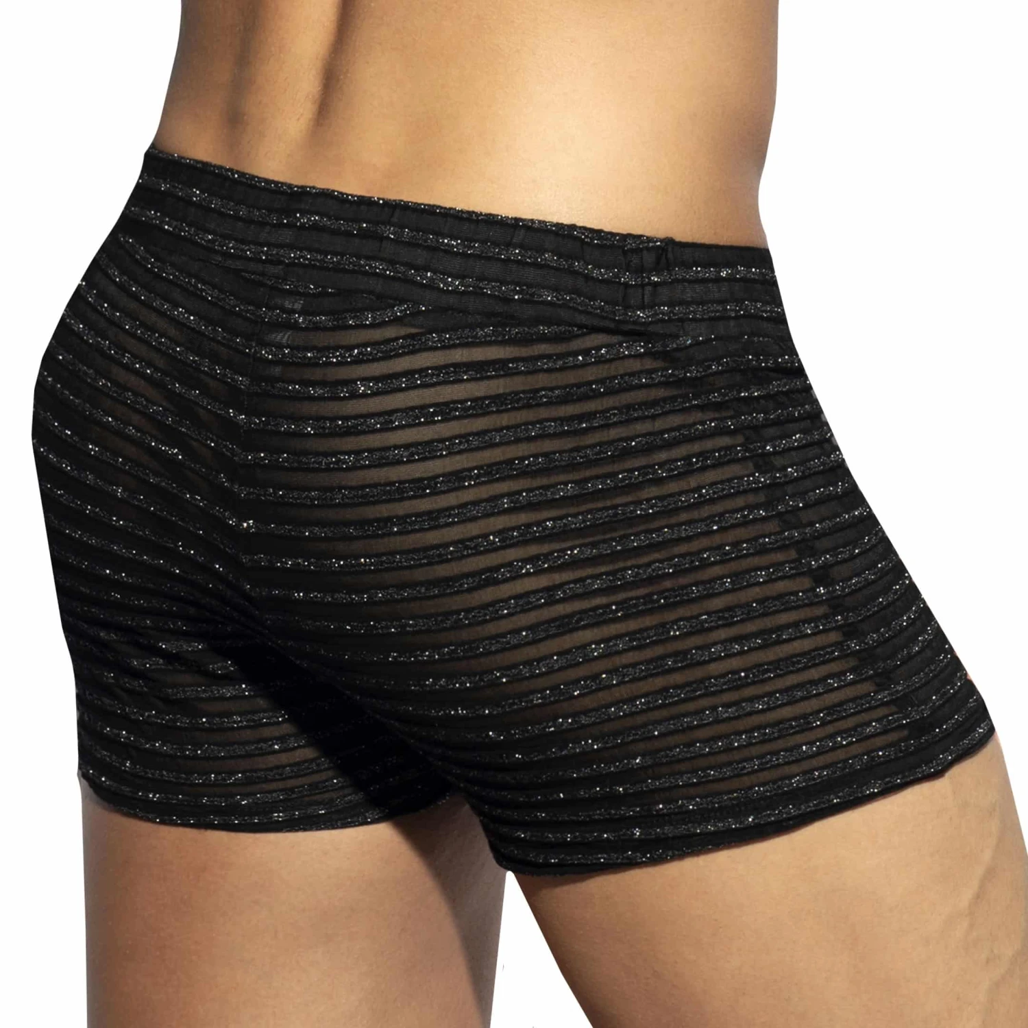 Short sexy et élégant en résille extensible transparente décorée de rayures scintillantes. Poche intérieure Kango pour un grand confort frontal. Ceinture élastique avec cordon de serrage intérieur. Logo ES Collection en silicone sur la jambe gauche.
