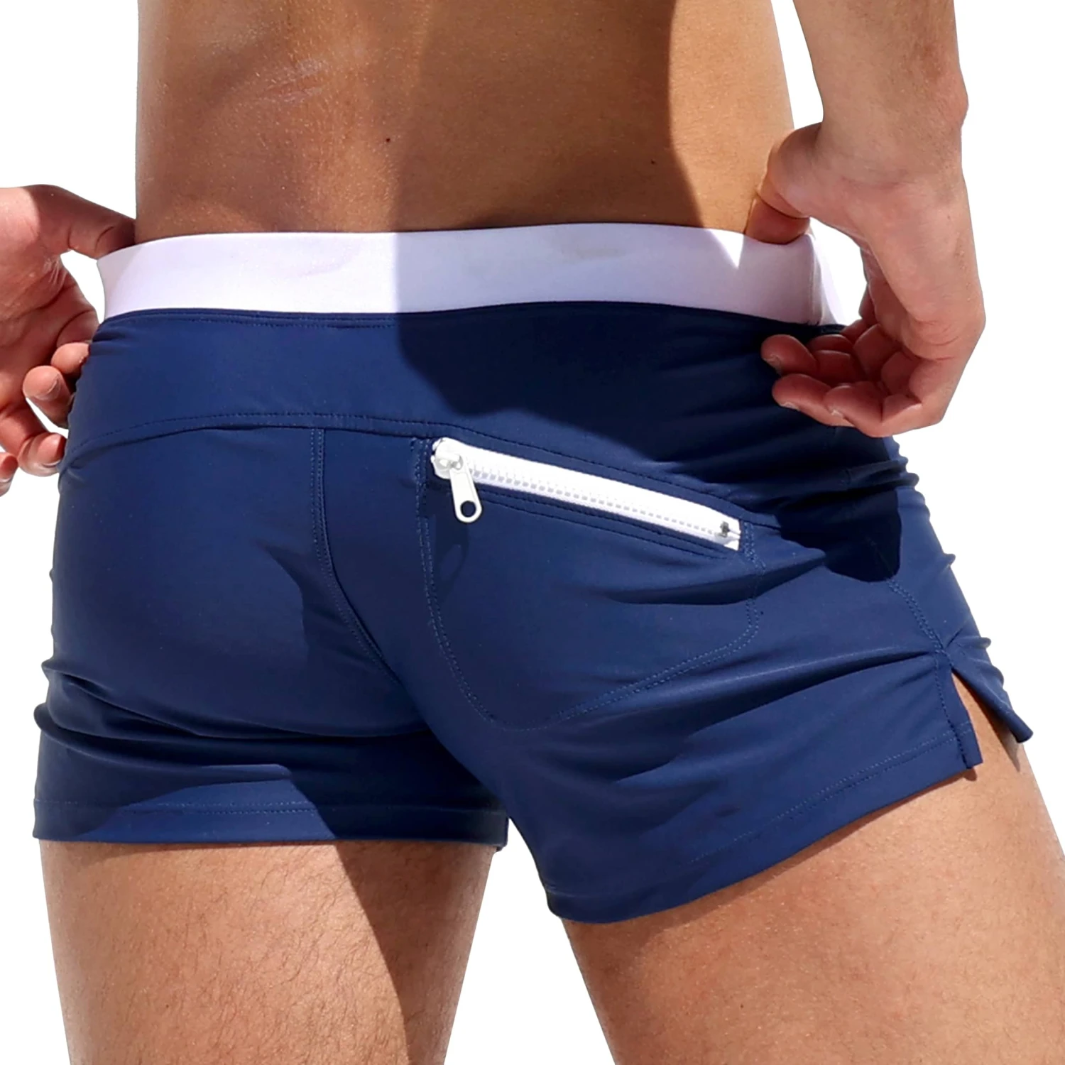 Short de bain en microfibre extensible de couleur intense. Pas de slip intérieur. Détails de couleur contrastée. Poche arriÚre zippée. Braguette factice. Logo Rufskin sur la jambe gauche. Ceinture élastique avec cordon de serrage intérieur. Fabriqué en Californie.