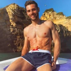 Short de bain sport en microfibre séchant rapidement. Bordures de couleur contrastée. Slip intérieur en mesh fin pour un grand confort. Logo SKU imprimé sur la cuisse gauche. Ceinture élastique avec cordon de serrage.