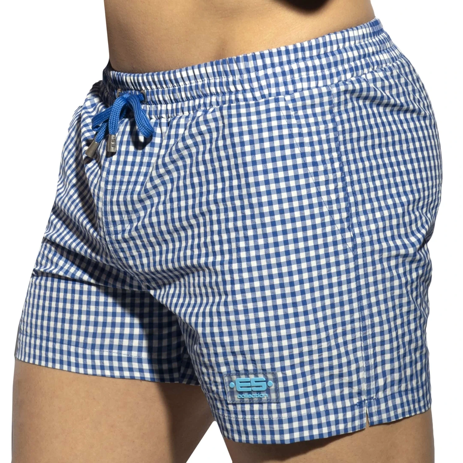 Short de bain taille basse en microfibre légÚre et confortable, séchant rapidement. Motif vichy à carreaux trÚs tendance. Slip intérieur U-Shape en mesh pour un grand confort. 3 poches. Logo ES Collection en silicone sur la cuisse gauche. Ceinture élastique avec cordon de serrage.