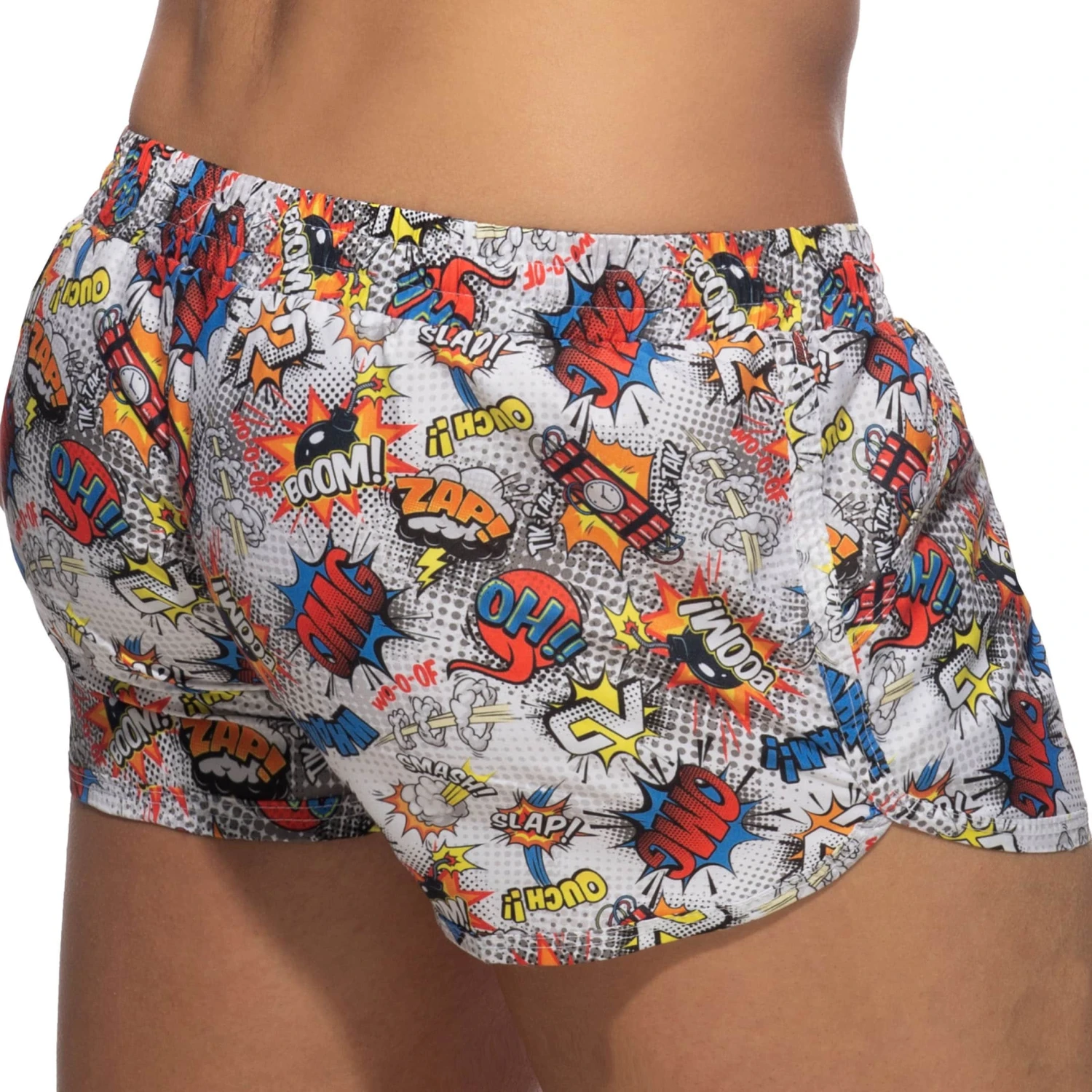 Short de bain taille basse en microfibre imprimĂ©e d’un motif cartoon original et colorĂ©. 2 poches sur les cĂŽtĂ©s. Slip intĂ©rieur U-Shape en mesh pour un grand confort. Ceinture Ă©lastique avec cordon de serrage.