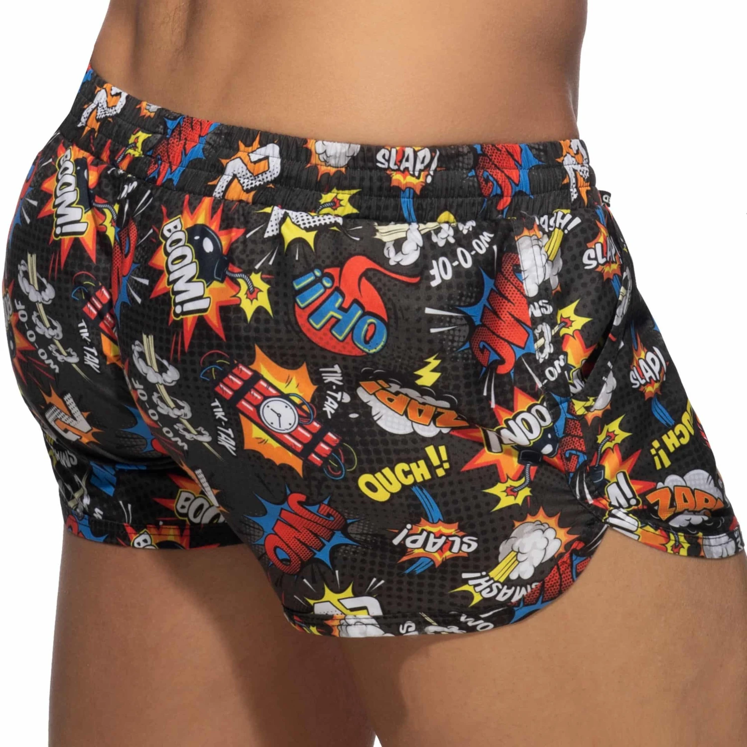 Short de bain taille basse en microfibre imprimĂ©e d’un motif cartoon original et colorĂ©. 2 poches sur les cĂŽtĂ©s. Slip intĂ©rieur U-Shape en mesh pour un grand confort. Ceinture Ă©lastique avec cordon de serrage.