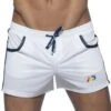 Short de bain taille basse en microfibre lĂ©gĂšre et confortable. Coupe courte et Ă©lĂ©gante. 2 poches sur les cĂŽtĂ©s. Slip intĂ©rieur U-Shape en mesh pour un grand confort. Logo Addicted en silicone cousu sur la cuisse gauche. Ceinture Ă©lastique double avec cordon de serrage. EXCLUSIVITE Les Dessous d’Apollon – Inderwear.