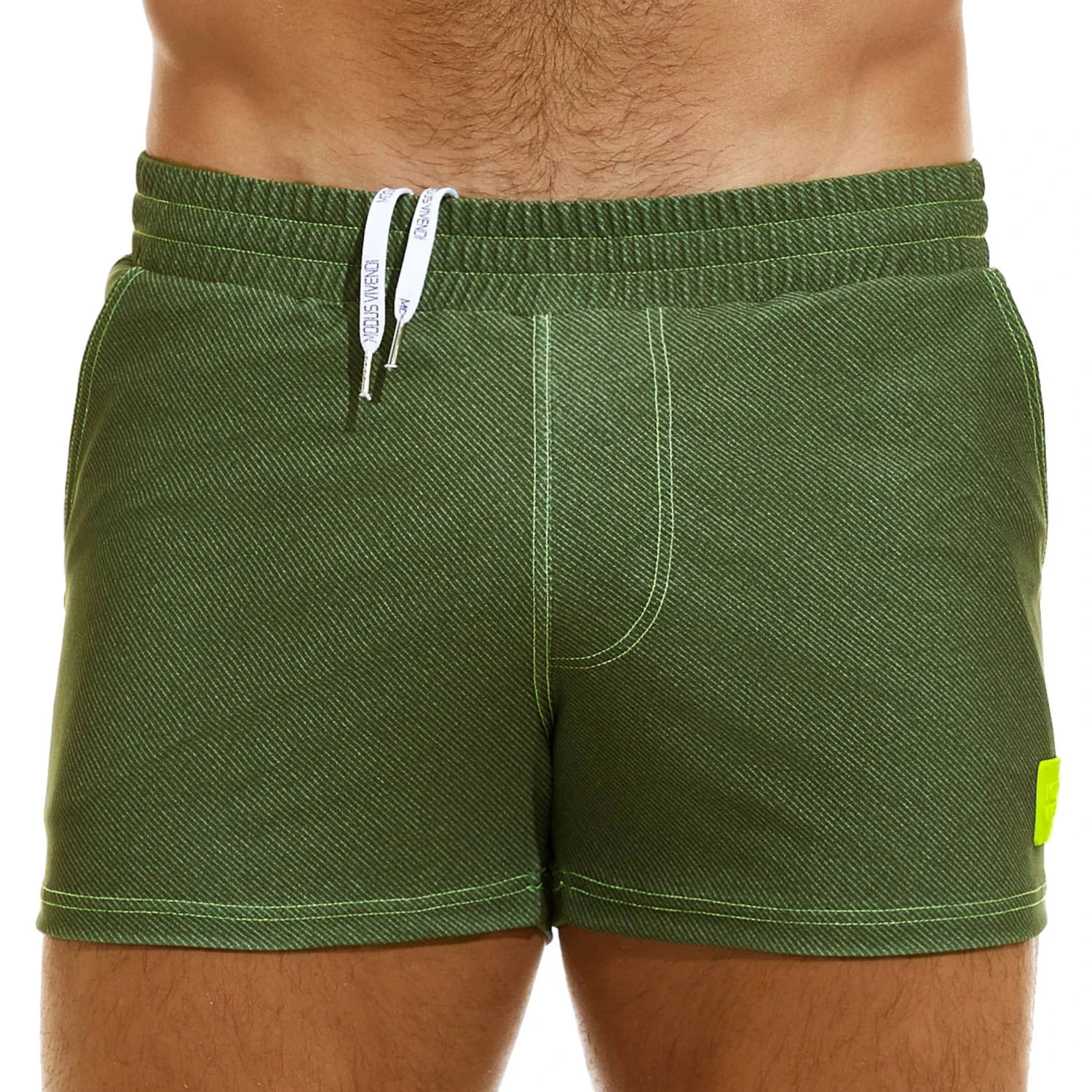 Short de bain en microfibre douce séchant rapidement. Imprimé et coutures imitant le jeans. Boutons métalliques décoratifs. 3 poches. Braguette factice. Slip intérieur. Ceinture élastique avec cordon de serrage. Logo MV en silicone sur la jambe gauche.