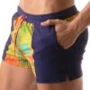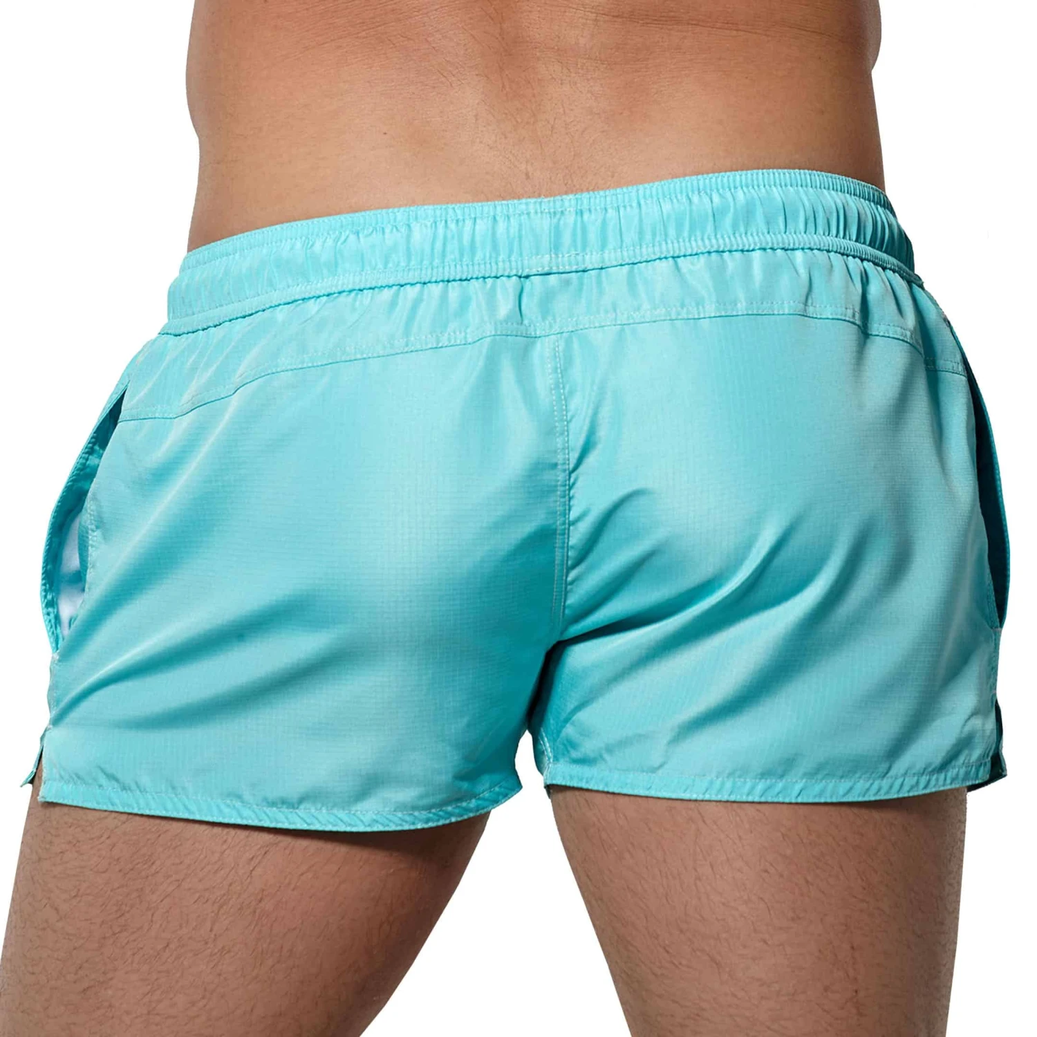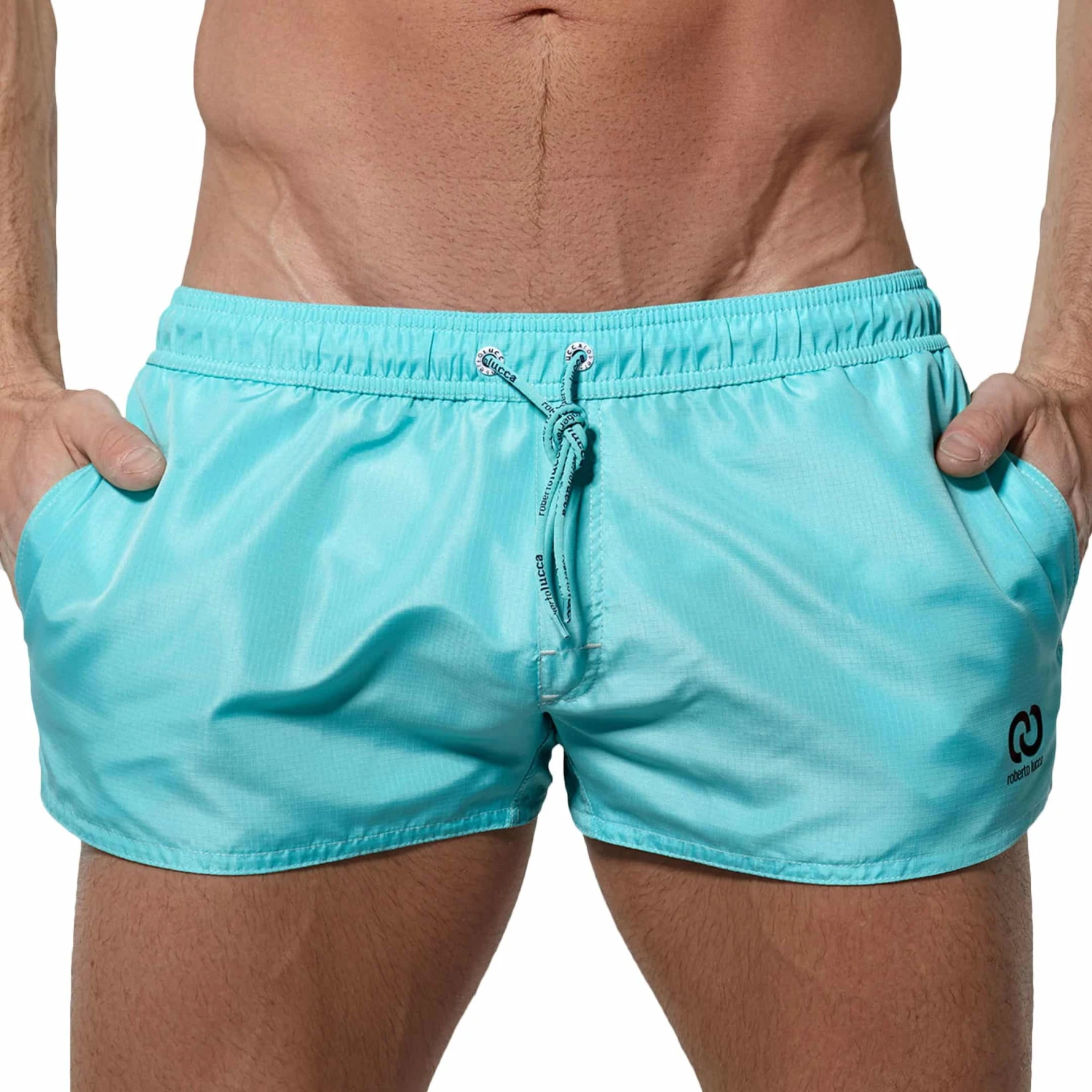 Short de bain taille basse, court et sexy en microfibre séchant rapidement. 2 poches. Slip intérieur en mesh. Braguette factice. Ceinture élastique avec cordon de serrage. Logo sur la cuisse gauche.
