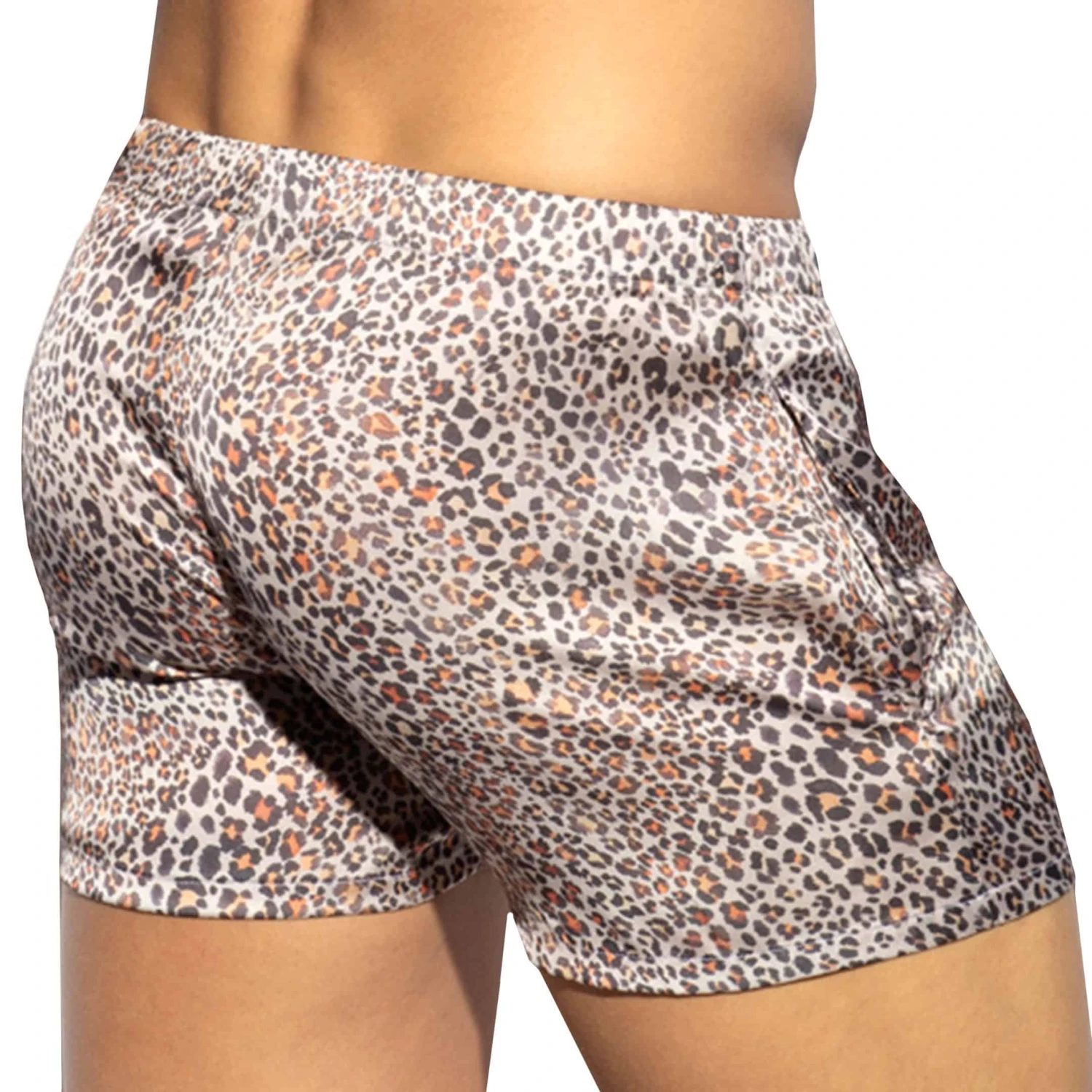 Short d’intĂ©rieur taille basse en microfibre satinĂ©e imprimĂ©e d’un motif lĂ©opard. 2 poches. Ceinture Ă©lastique avec plaque mĂ©tallique dorĂ©e signĂ©e ES Collection.