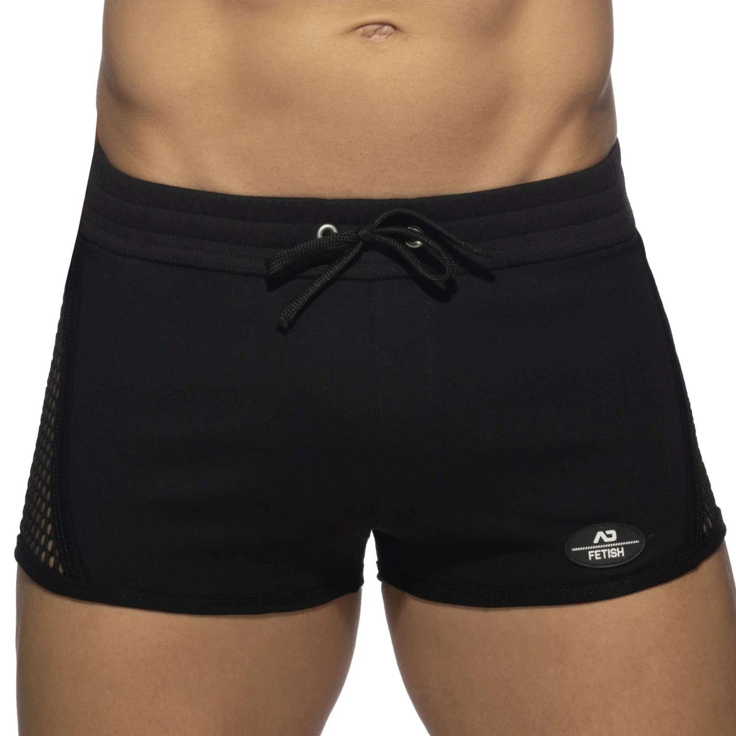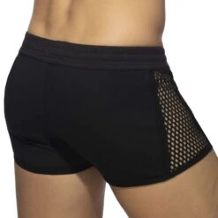 Short sexy en coton doux. Panneaux transparents en résille à maillage large sur les cÎtés. Poche intérieur Kango pour un grand confort fronta. Ceinture élastique recouverte avec cordon de serrage. Logo AD Fetish en silicone sur la cuisse gauche.