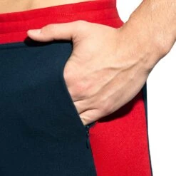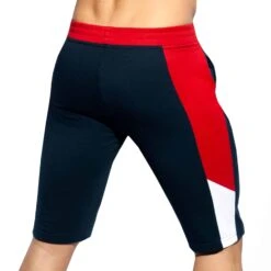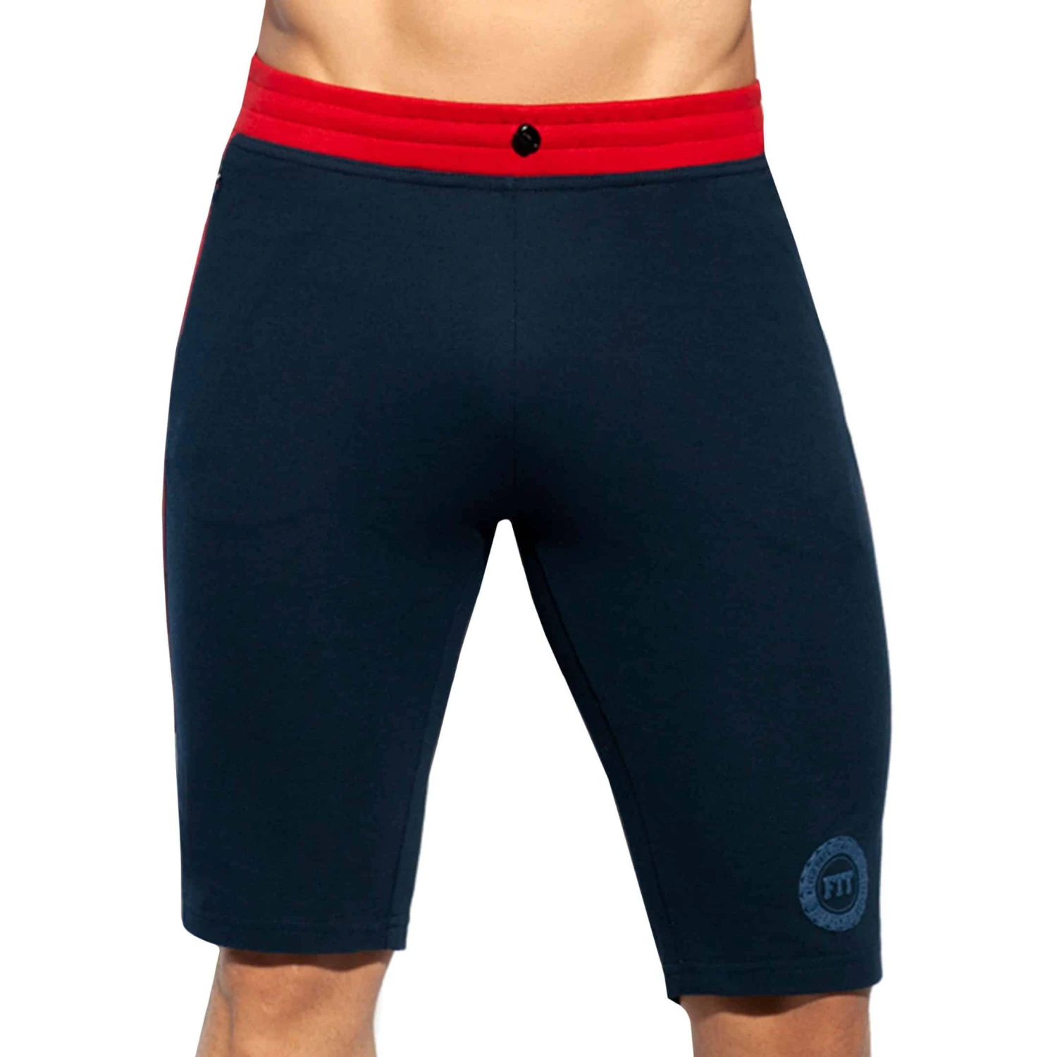 Short long en mélange de coton et de microfibre. 2 poches zippées. Bande sport tricolore le long des cuisses. Logo FIT sur la cuisse gauche. Ceinture élastique avec cordon de serrage.