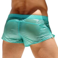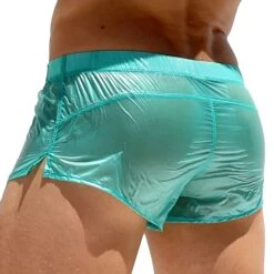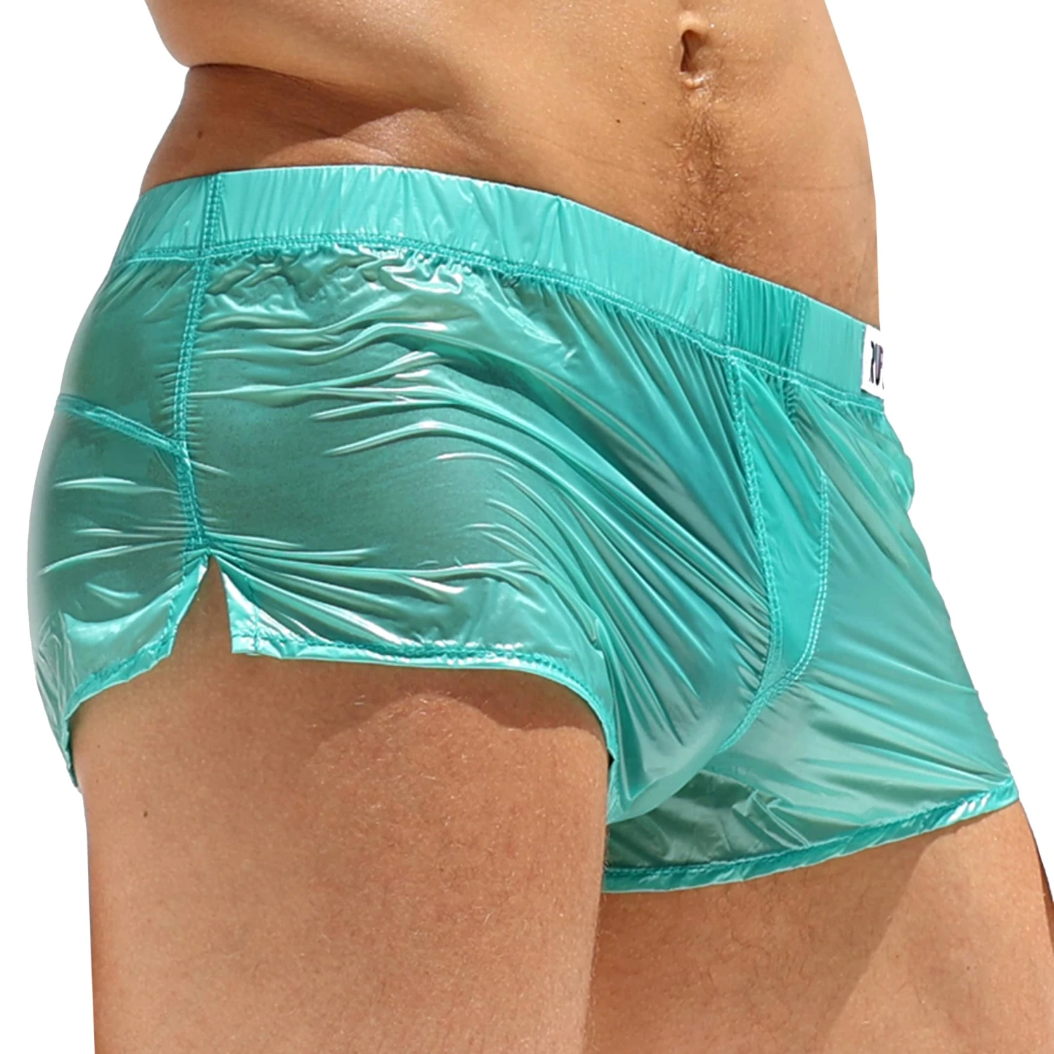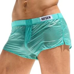 Short trÚs sexy en tissu transparent et ultra léger. A porter par-dessus un maillot de bain ou sans rien dessous ! Coupe courte et échancrée sur le cÎté. Braguette factice. Ceinture élastique recouverte signée Rufskin. Fabriqué en Californie.