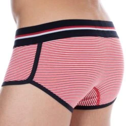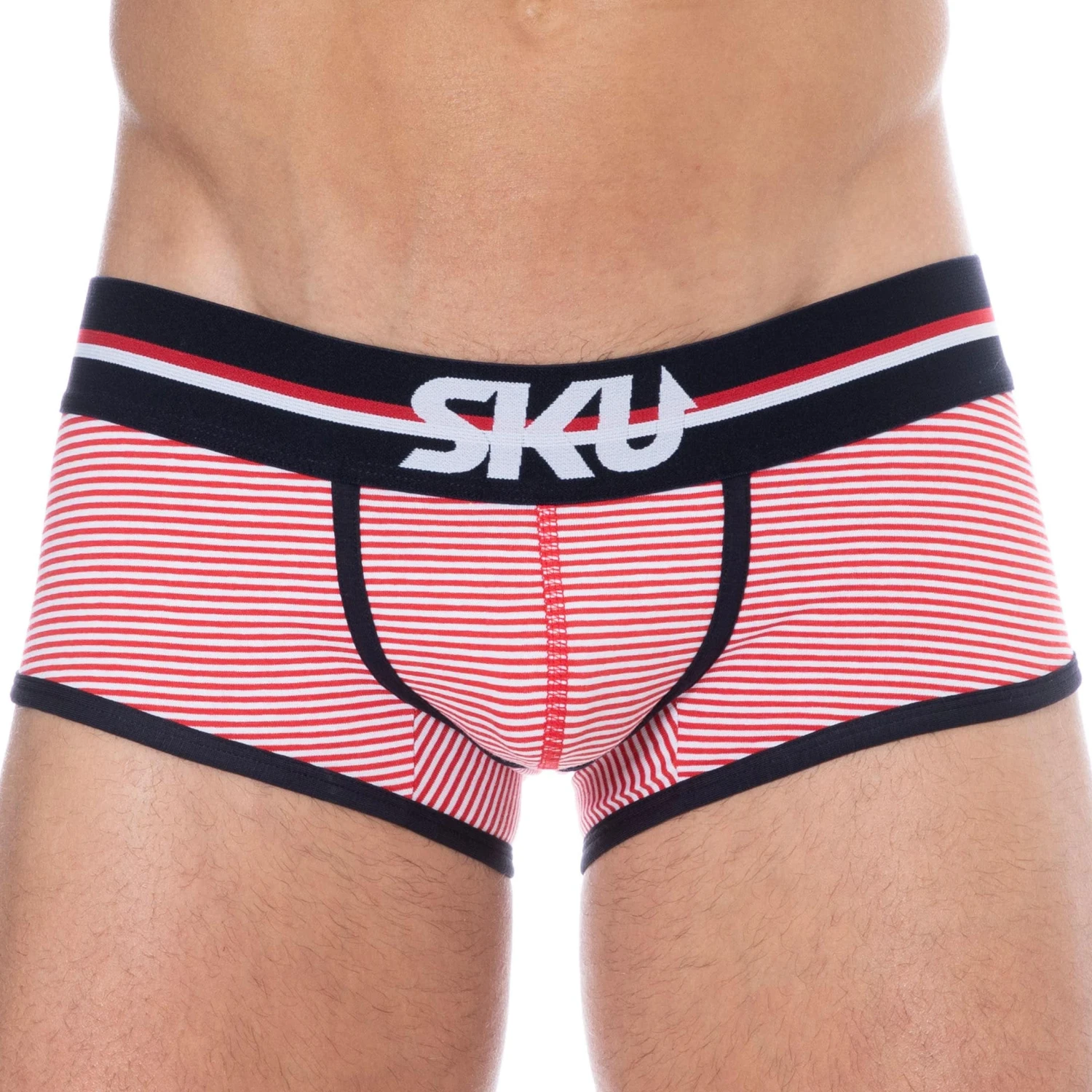 Shorty sport et sexy en coton premium doux et extensible. Fine rayure horizontale. Coupe taille basse ajustée. Poche frontale préformée assurant un excellent maintien. Confort enveloppant sur les fesses. Belle échancrure sur le cÎté. Ceinture tricolore large et douce signée SKU. Bordures contrastées.
