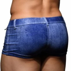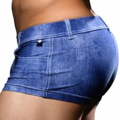 Shorty de bain taille basse en microfibre stretch douce et confortable. Imprimé façon jeans. Coupe trÚs ajustée. Braguette et poches factices. Bouton métallique décoratif. Ceinture élastique amincissante. Edition limitée.