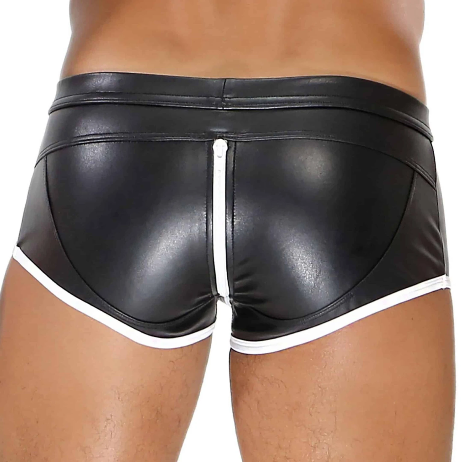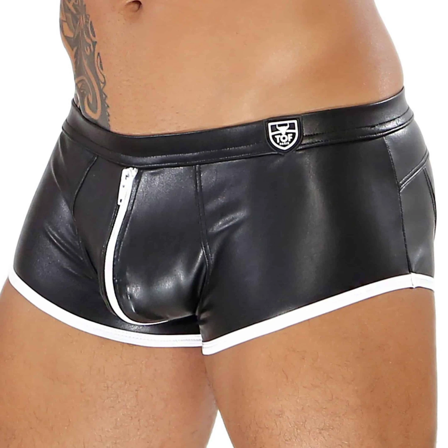 Shorty taille basse ajusté en microfibre stretch imitant parfaitement le cuir, pour un look trÚs fetish. Fermeture Eclair double curseur avec protection anti-pincement, pour une ouverture intégrale sans risque. Ecusson TOF Paris cousu à la ceinture. Fabrication française.