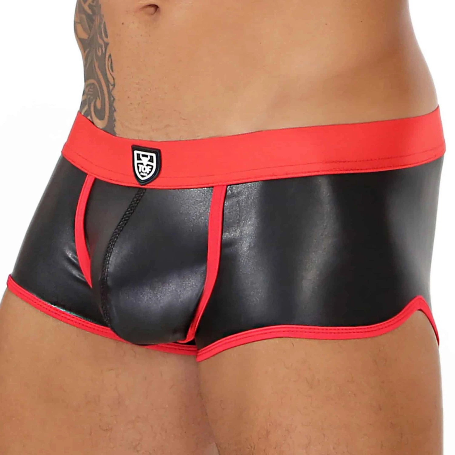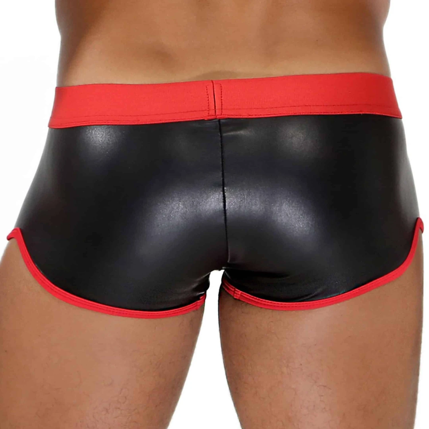 Shorty taille basse ajusté en microfibre stretch imitant parfaitement le cuir, pour un look trÚs fetish. Ecusson TOF Paris cousu sur la ceinture élastique. Fabrication française.