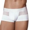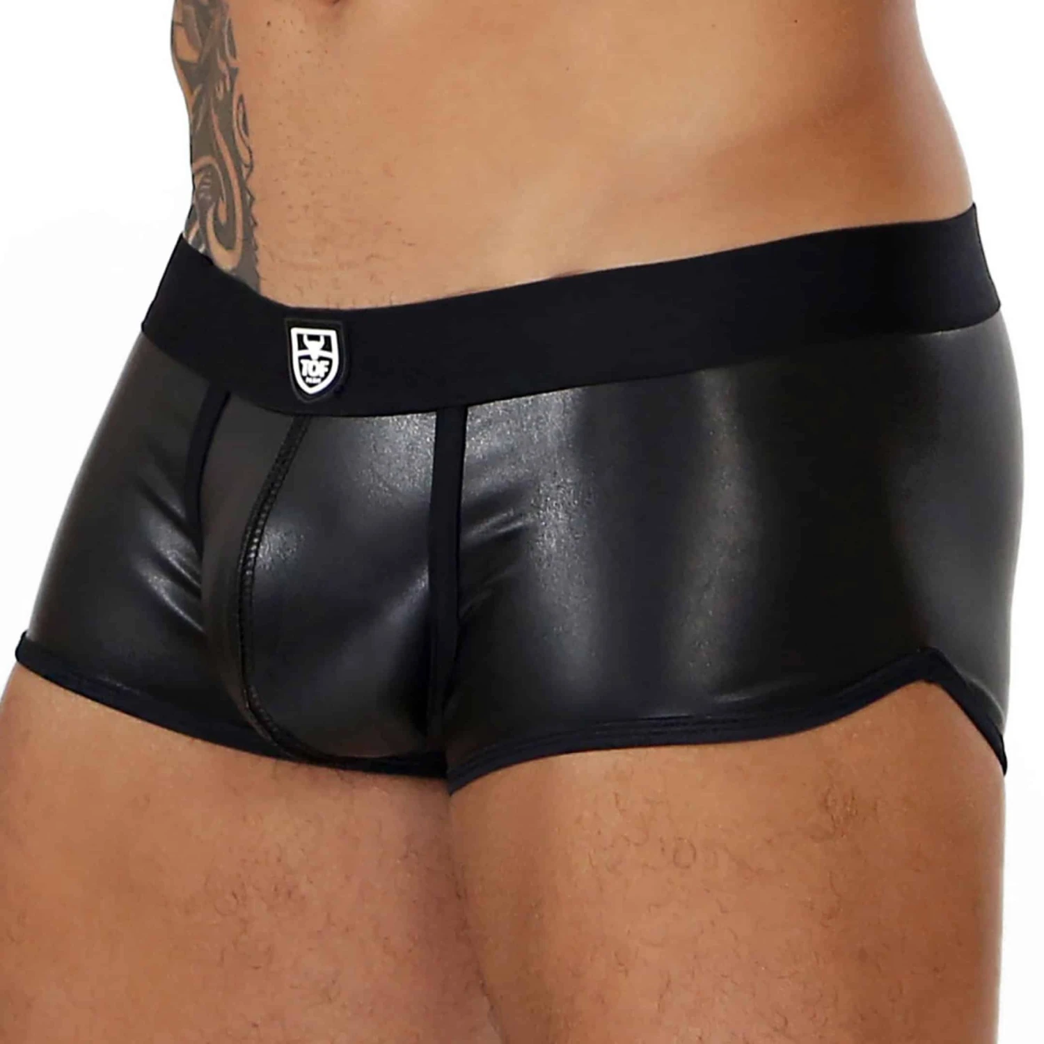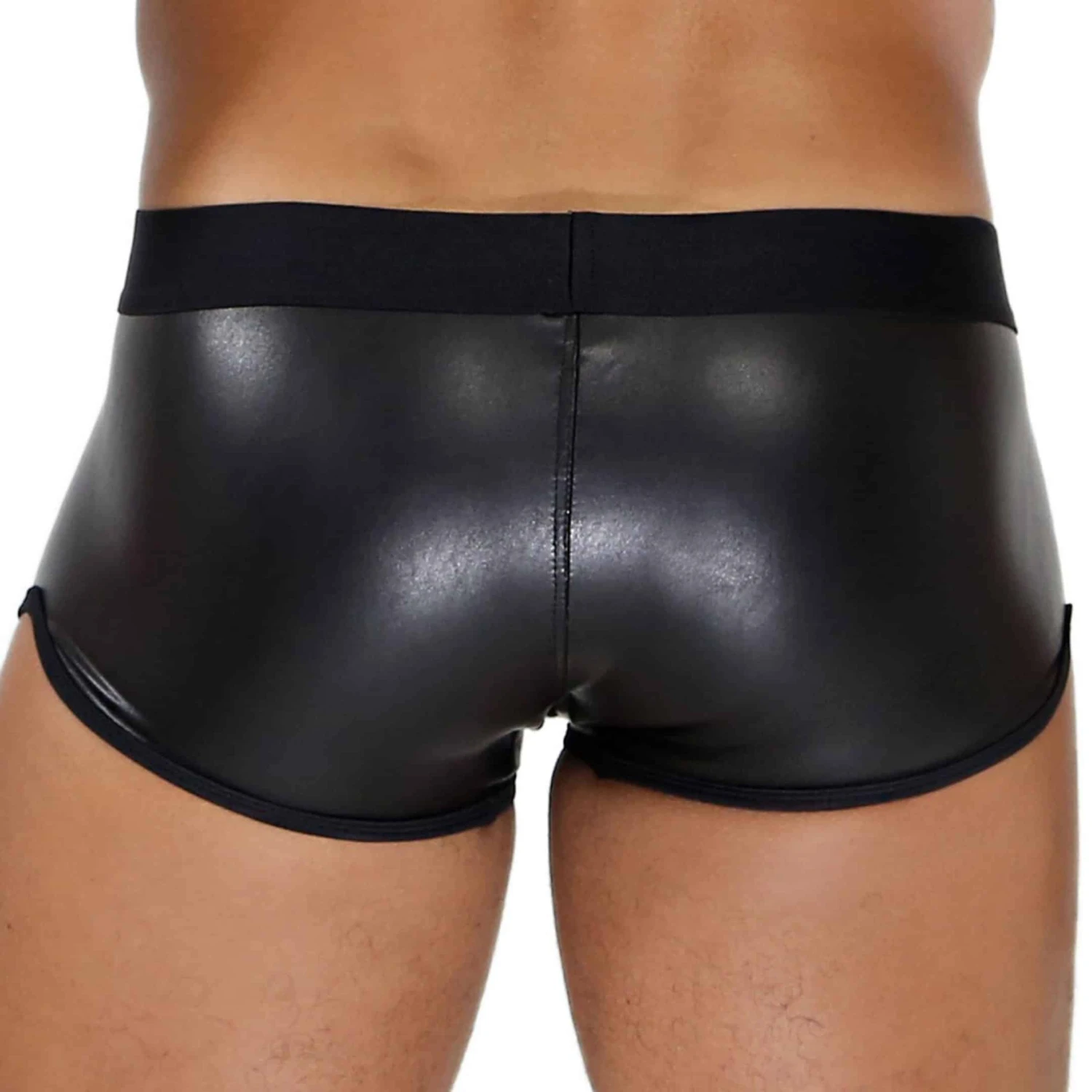 Shorty taille basse ajusté en microfibre stretch imitant parfaitement le cuir, pour un look trÚs fetish. Ecusson TOF Paris cousu sur la ceinture élastique. Fabrication française.