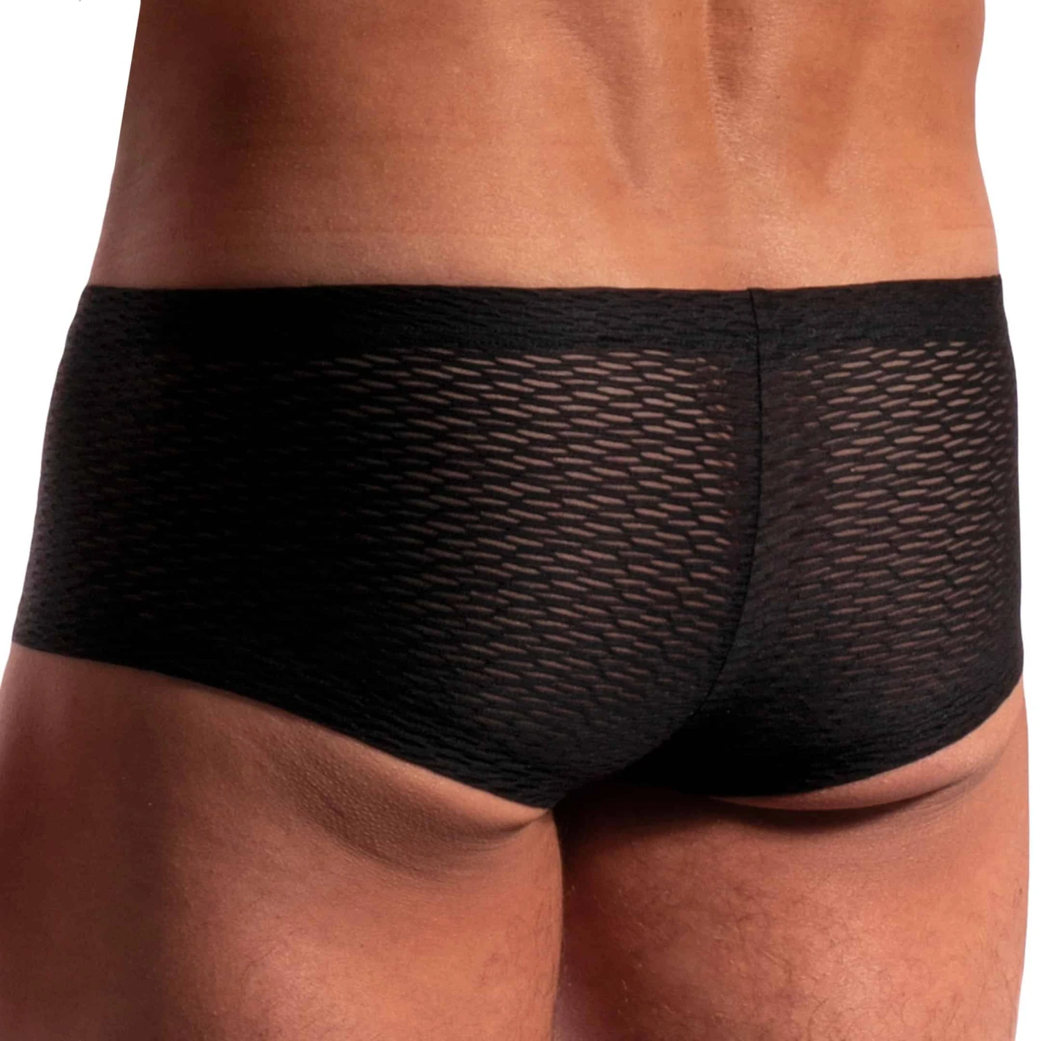 Mini boxer à la fois sophistiqué et sauvage avec sa combinaison de tissu ajouré semi-transparent et de simili cuir. Coupe minimaliste trÚs ajustée. Etiquette Manstore sur la fine ceinture élastique.