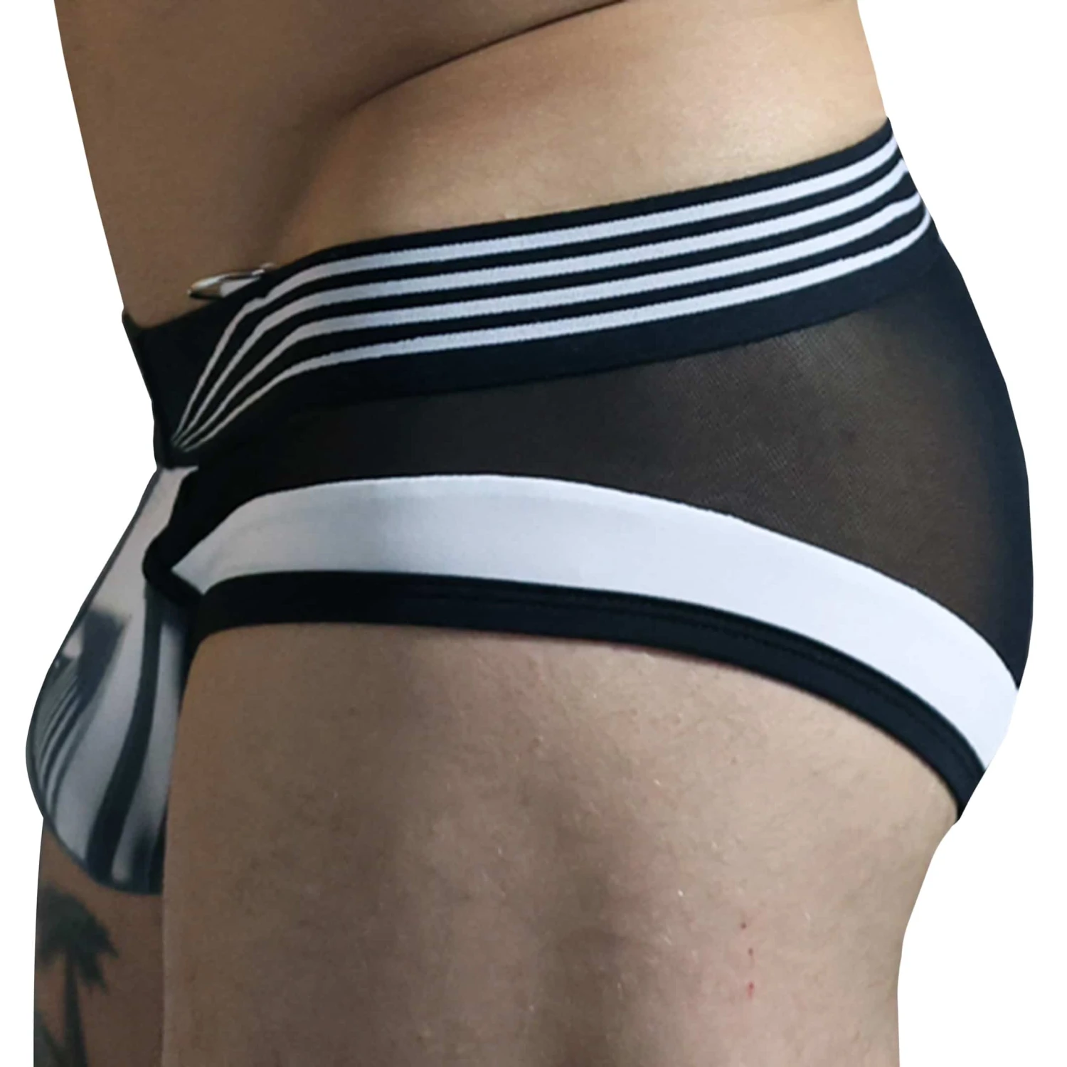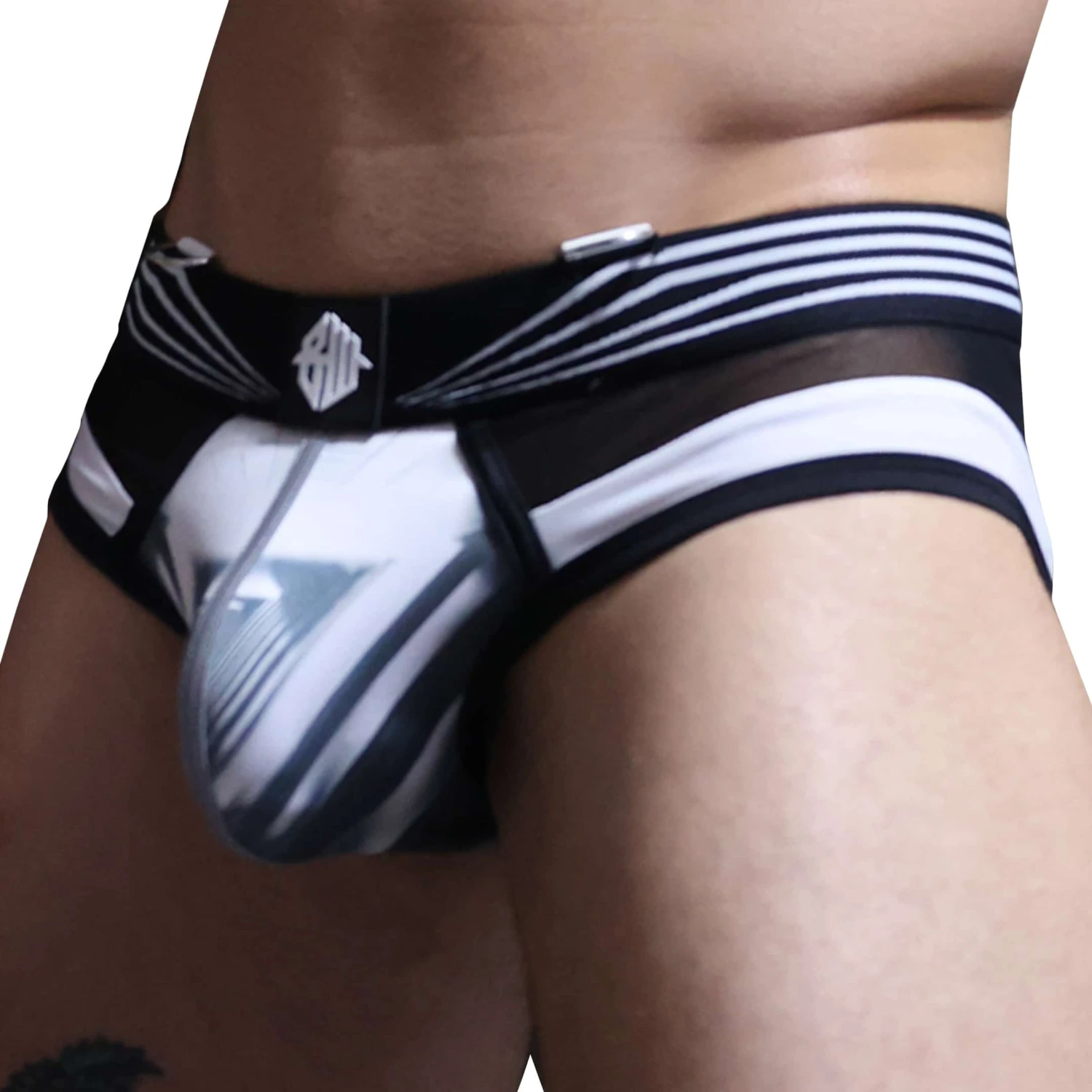 Slip trÚs sexy en microfibre extensible. EmpiÚcements en résille transparente. Poche frontale imprimée numériquement. Bande centrale argentée réfléchissant la lumiÚre. Patchs Breedwell en PVC de qualité supérieure. Anneaux métalliques à la taille pour attacher au harnais Akira (vendu séparément).