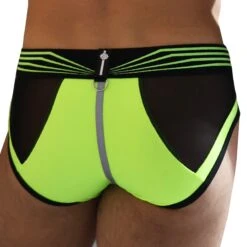 Slip trÚs sexy en microfibre extensible. EmpiÚcements en résille transparente. Poche frontale imprimée numériquement. Bande centrale argentée réfléchissant la lumiÚre. Patchs Breedwell en PVC de qualité supérieure. Anneaux métalliques à la taille pour attacher au harnais Akira (vendu séparément).