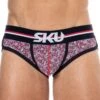Slip en coton stretch doux et agréable à porter. Imprimé combinant rayures et logos. Coupe simple et confortable. Poche frontale doublée. Ceinture élastique signée Emporio Armani.