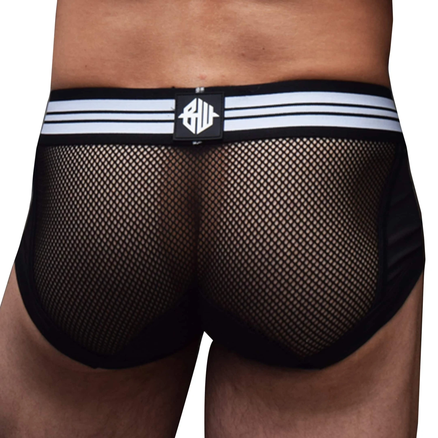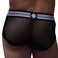Slip sexy en microfibre extensible douce. EmpiÚcements en résille transparente sur les cÎtés et les fesses. Poche frontale opaque non doublée. Ceinture élastique rayée avec patch Breedwell en PVC devant et derriÚre.