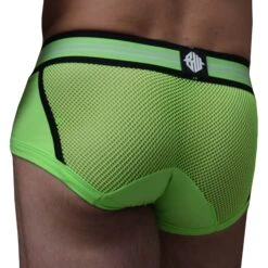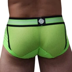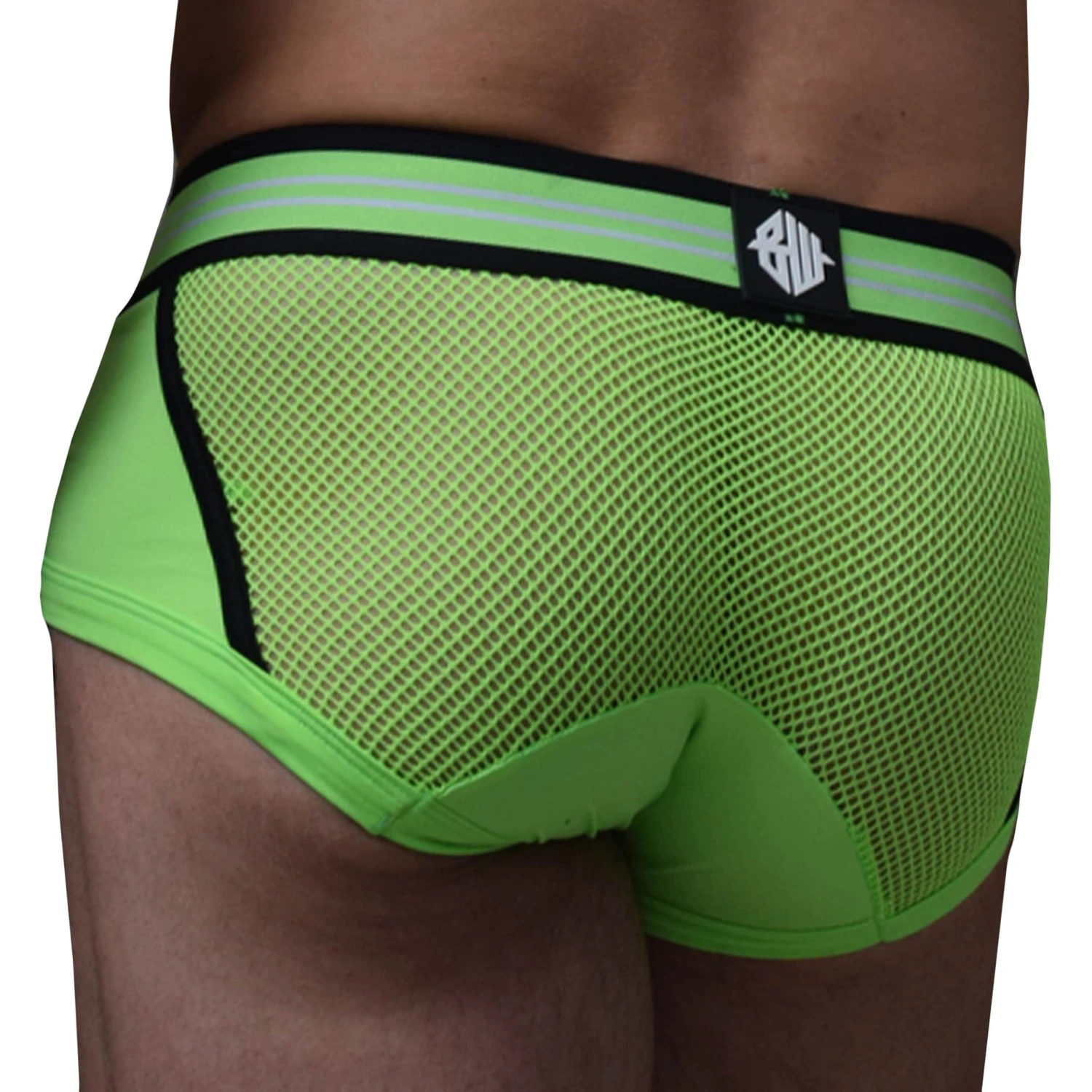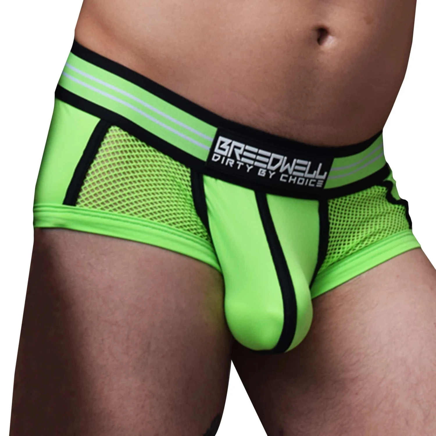 Slip sexy en microfibre extensible douce. EmpiÚcements en résille transparente sur les cÎtés et les fesses. Poche frontale opaque non doublée. Ceinture élastique rayée avec patch Breedwell en PVC devant et derriÚre.