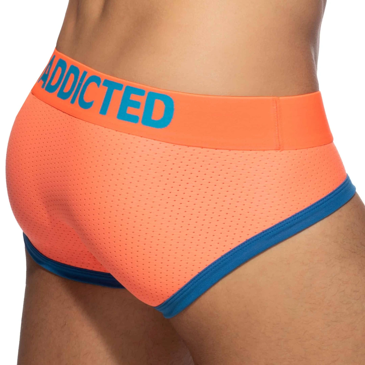 Slip taille basse trĂšs ajustĂ© en mesh sport respirant et confortable de couleur fluo. Poche frontale non doublĂ©e. Bordures de couleur contrastĂ©e. Ceinture Ă©lastique signĂ©e Addicted. EXCLUSIVITE : coupe conçue par Les Dessous d’Apollon – Inderwear.