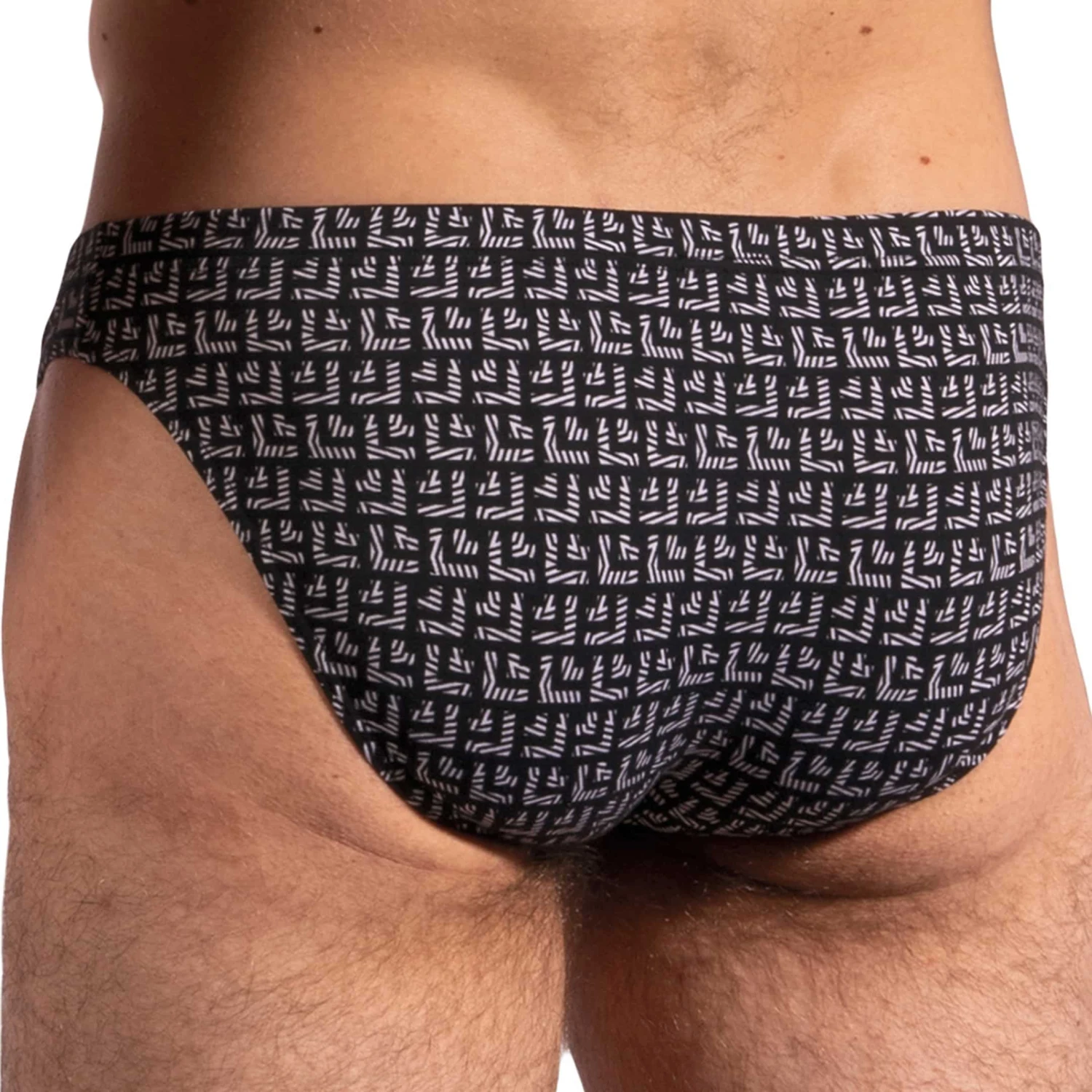 Slip doux et confortable en coton modal extensible de qualité premium. Motif géométrique. Coupe ajustée. Non doublé. Logo métallique Olaf Benz sur la fine ceinture élastique recouverte.