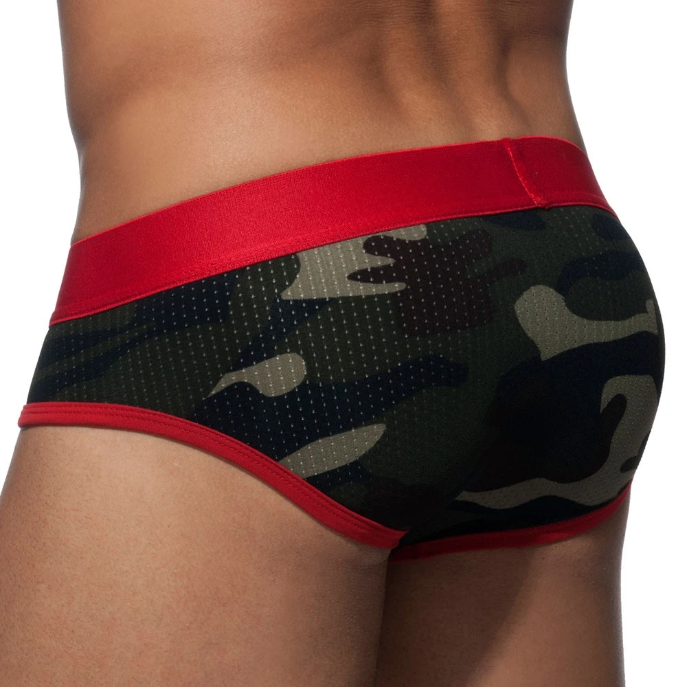 Slip taille basse trĂšs ajustĂ© en micro mesh super extensible, lĂ©ger et respirant imprimĂ© d’un motif camouflage. Double bande contrastĂ©e sur la poche frontale. Ceinture Ă©lastique avec logo AD en silicone.