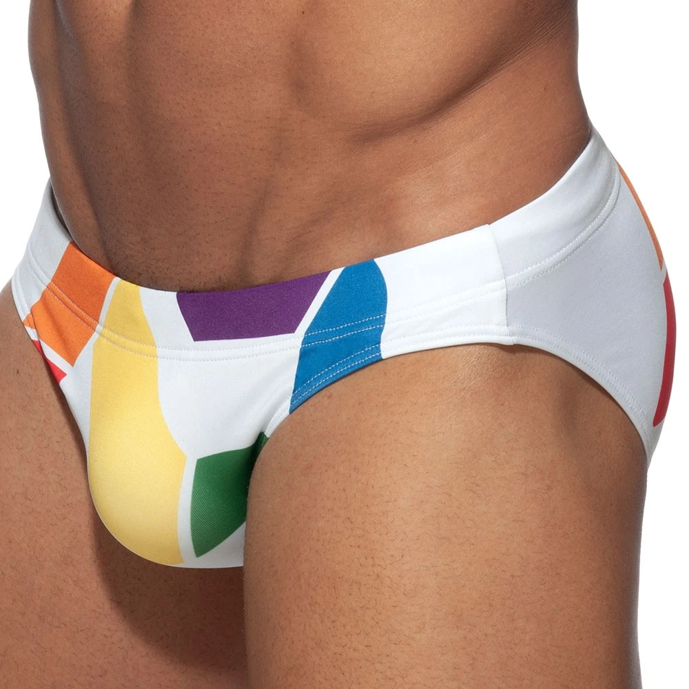 Slip de bain taille basse trĂšs sexy en microfibre sĂ©chant rapidement. SystĂšme Pack Up avec mousse amovible pour mettre en avant votre masculinitĂ©. Logo AD aux couleurs de l’arc-en-ciel devant et derriĂšre. Ceinture Ă©lastique avec cordon de serrage intĂ©rieur.