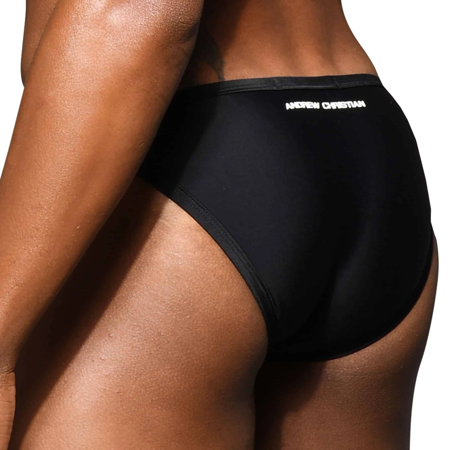 Slip de bain sexy en microfibre douce, confortable et lĂ©gĂšre. Coupe bikini taille basse trĂšs ajustĂ©e avec chaĂźnettes mĂ©talliques sur les cĂŽtĂ©s. Poche frontale Almost Naked qui Ă©pouse et soutient les organes gĂ©nitaux sans les comprimer. Logo Andrew Christian Ă l’arriĂšre. Edition LimitĂ©e.