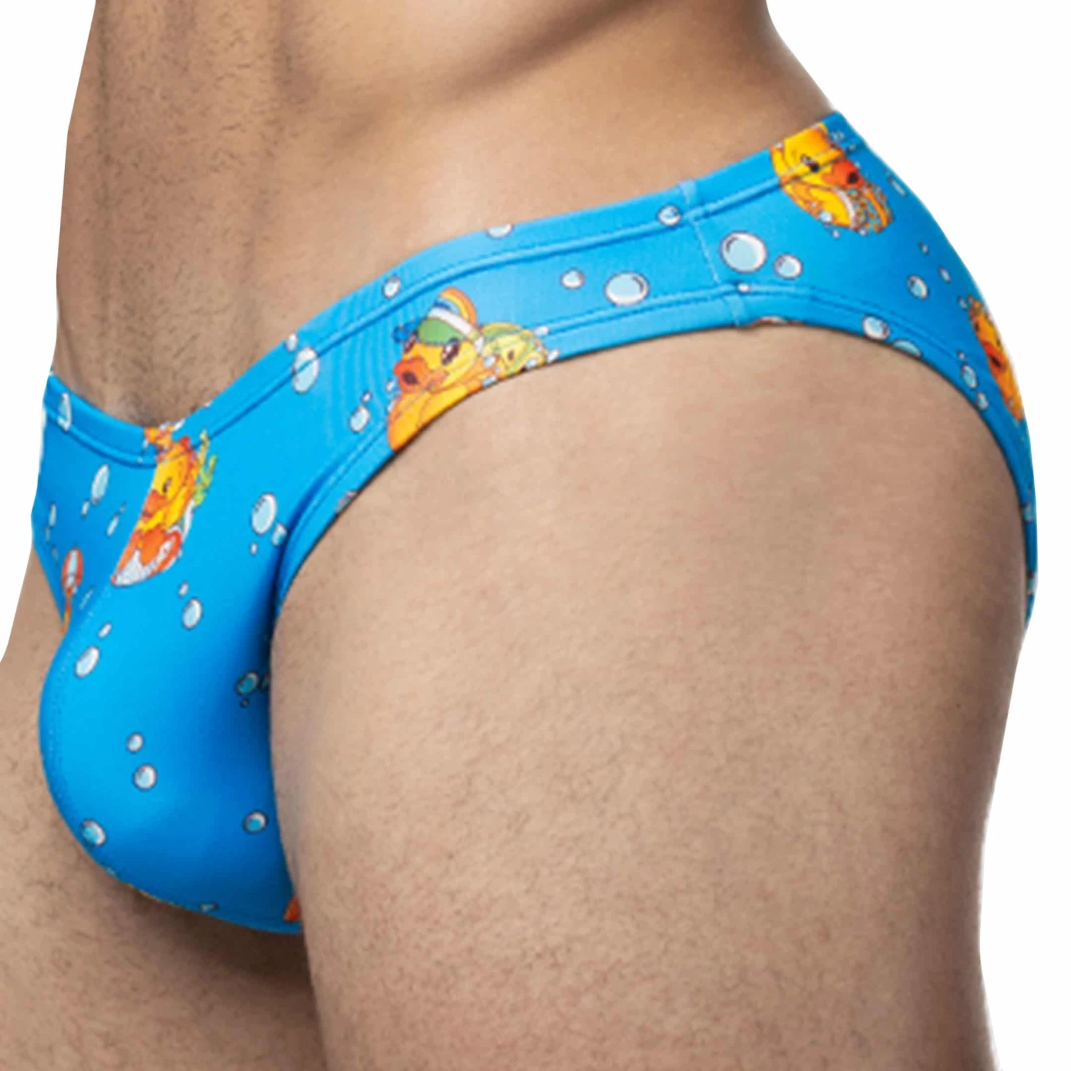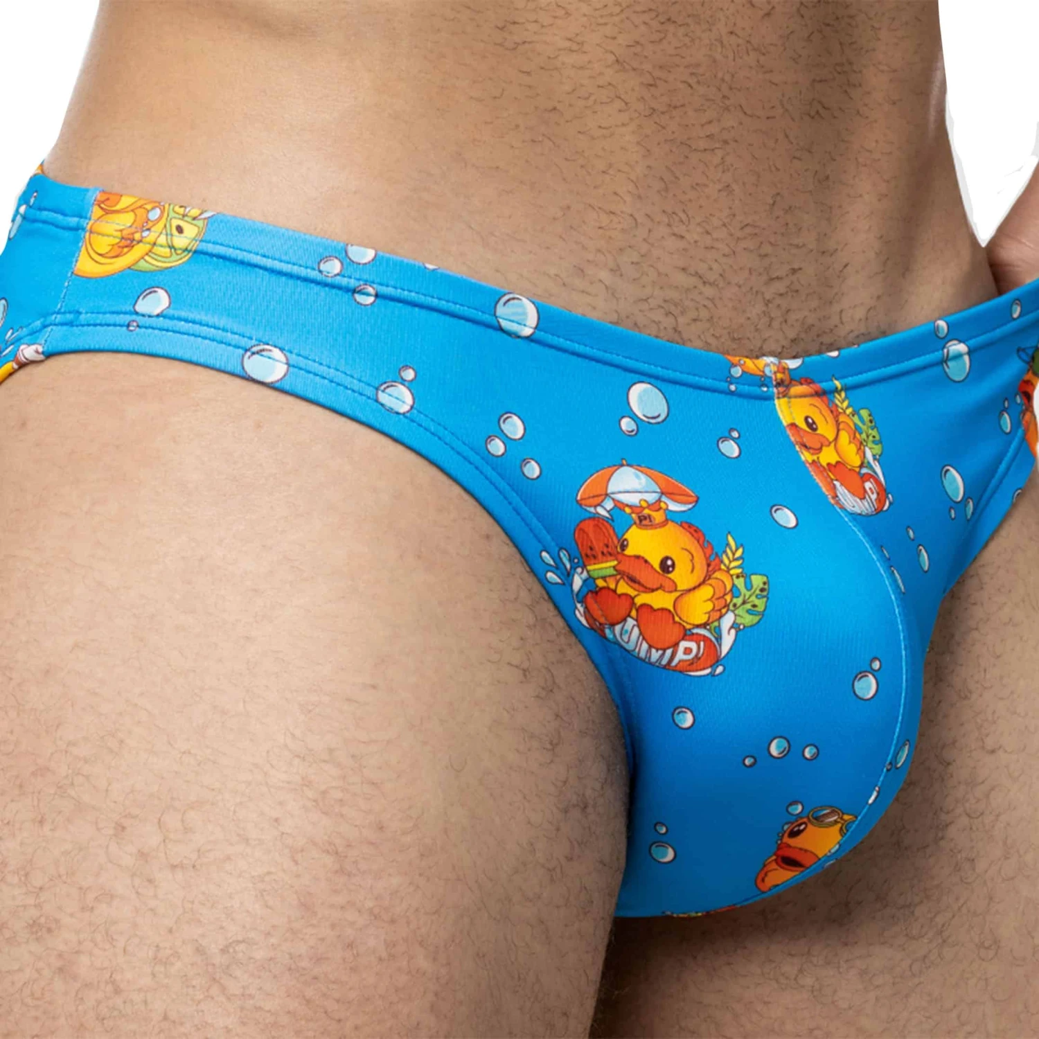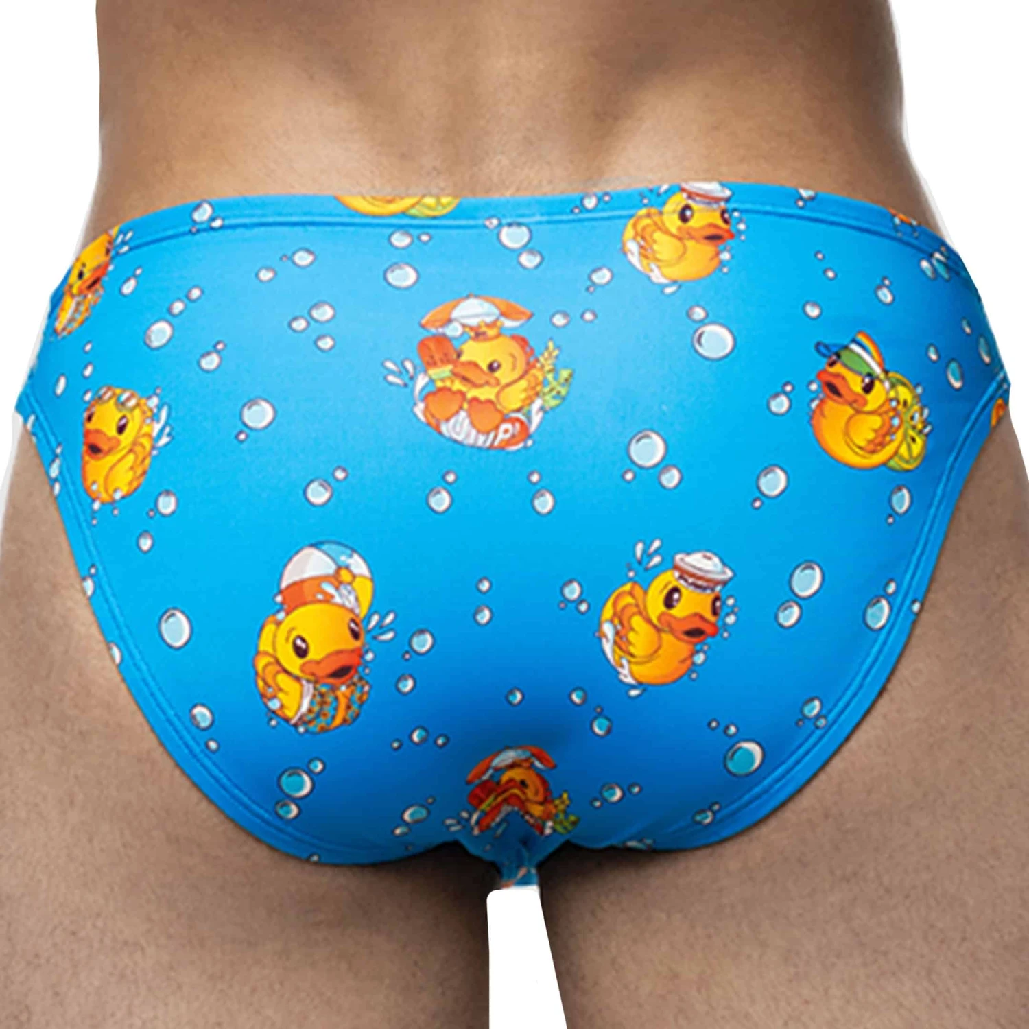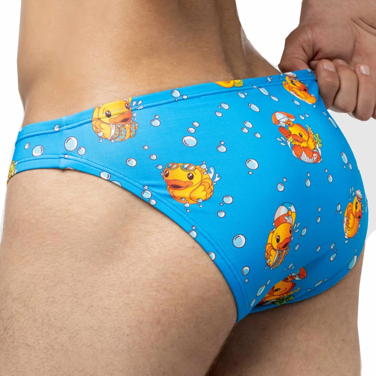 Slip de bain doux et confortable en microfibre extensible recyclée, séchant rapidement. Tissu de grande qualité avec protection UPF 50+. Coupe bikini taille basse super ajustée. Motif petits canards imprimé avec un procédé écologique sans eau.