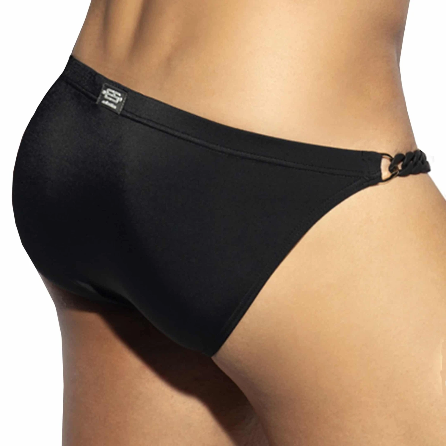 Slip de bain bikini taille basse en microfibre extensible sĂ©chant rapidement. Design sophistiquĂ© avec chaĂźnes mates et anneaux mĂ©talliques dorĂ©s sur les cĂŽtĂ©s. SystĂšme Pack Up intĂ©grĂ© avec mousse amovible pour plus de volume frontal. Poche frontale moulĂ©e sans couture pour un confort optimal. Ceinture Ă©lastique recouverte. Logo ES Collection en silicone Ă l’arriĂšre.